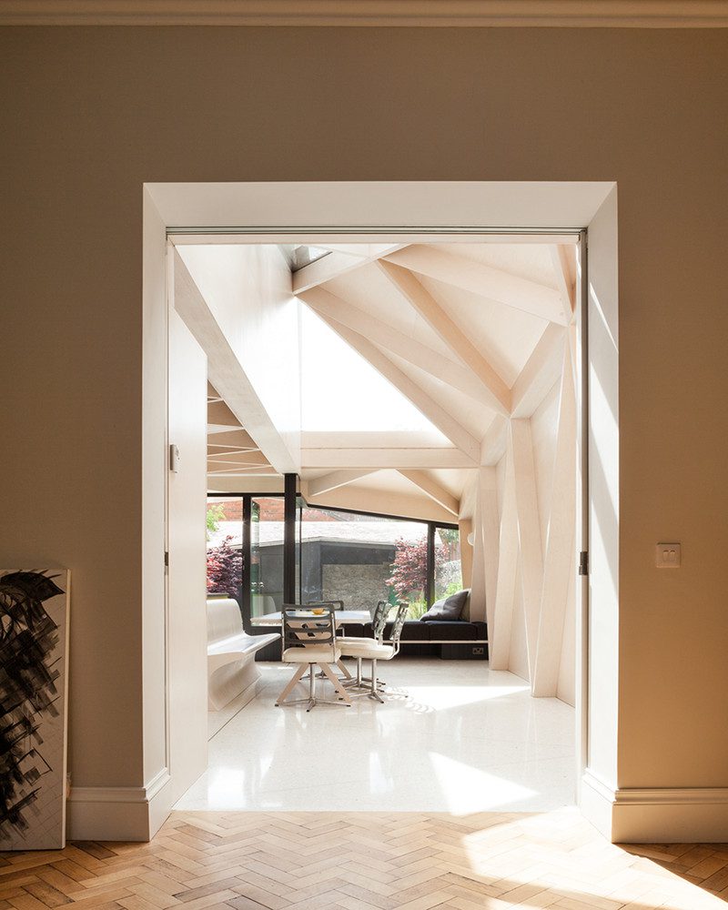 The main aim was to remove the aged conservatory which acted as a light source for the ground floor as well as expand and integrate the rear part of the building according to the adjacent neighborhood. To rectify this problem, the structural frame made of plywood has been introduced.