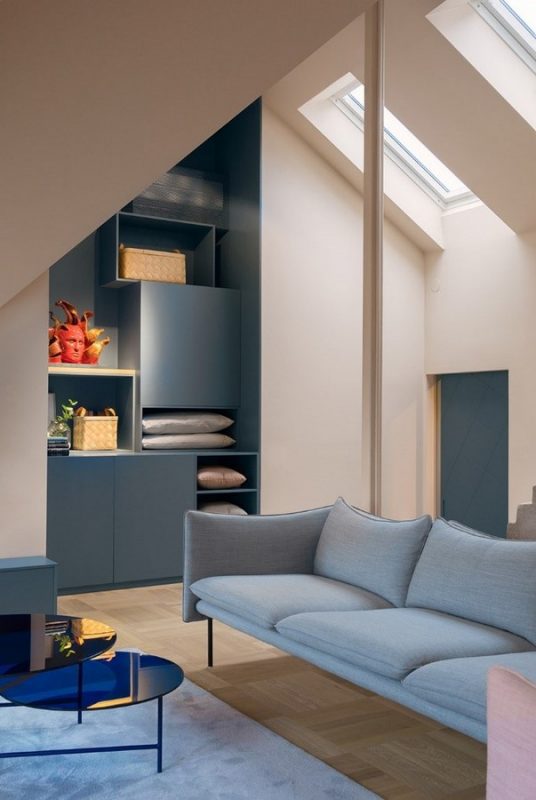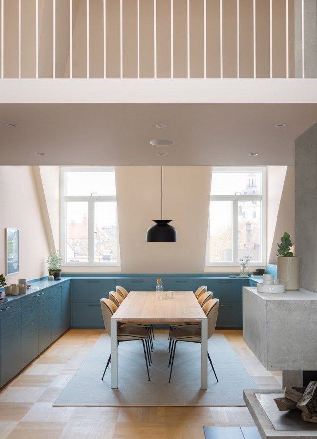 When developing the architecture model for this studio, the note design studio opposed the idea of using white in the space when remodeling a loft apartment built in Sweden in the 1930s. The use of expensive furniture pieces and various shades of blue gave the project its standout quality. Note design studio did this to foster a calm and cozy atmosphere. The walls, floors, and some furniture were painted in sandy tones.