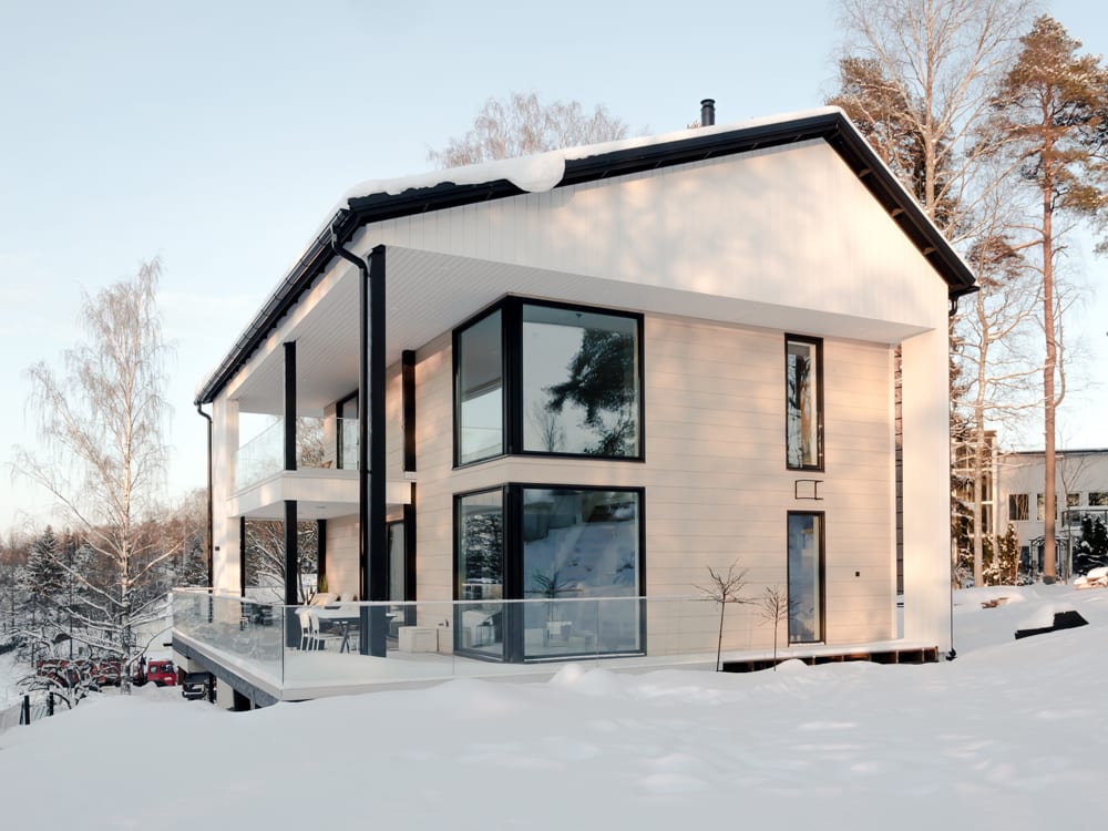 Villa Mustalahti is a contemporary, two-story, light-colored log home that dazzles with its distinctive appearance and Scandinavian style.