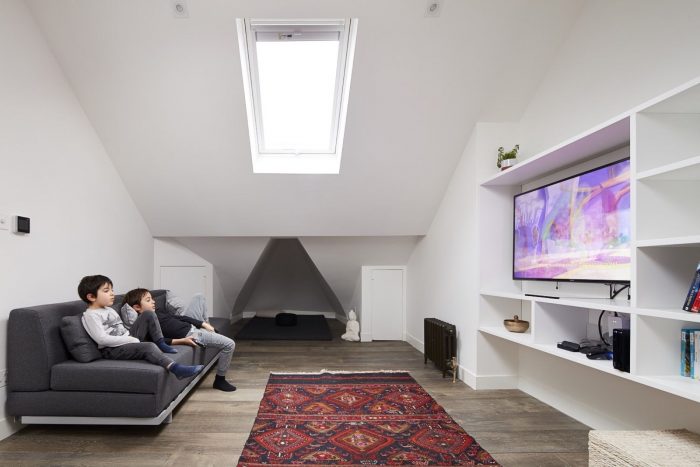 Our children took a central part in developing both the brief and the design of their own bedroom. Resulting in a climbing wall leading to a ‘secret space’ at the eves of the single pitch original house extension. And what better way to come back down than use the fireman pole!
