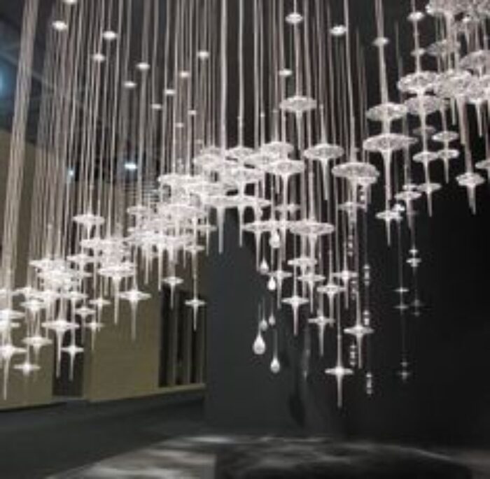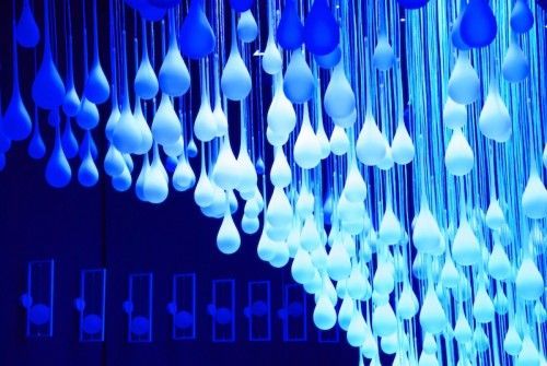 Looking to the light installation designed by the company you’ll notice the impact it leaves on the space. The suspended structure with the blue, purple and white colors dissolves into the space like an inverted pyramid shape that seems to rest in its position giving visual balance. There’s another movement with shades of blue and white delivering another color-visual experience.