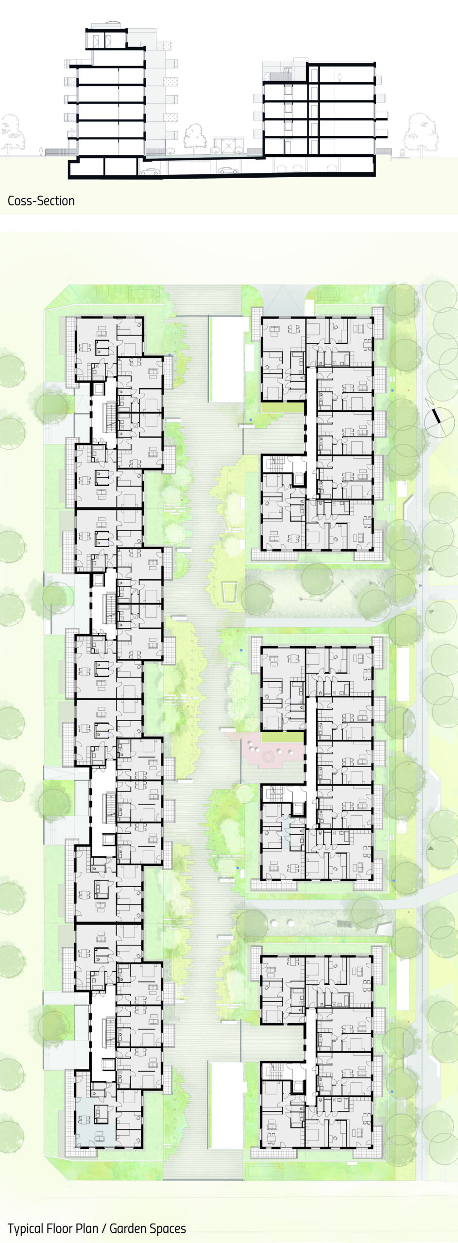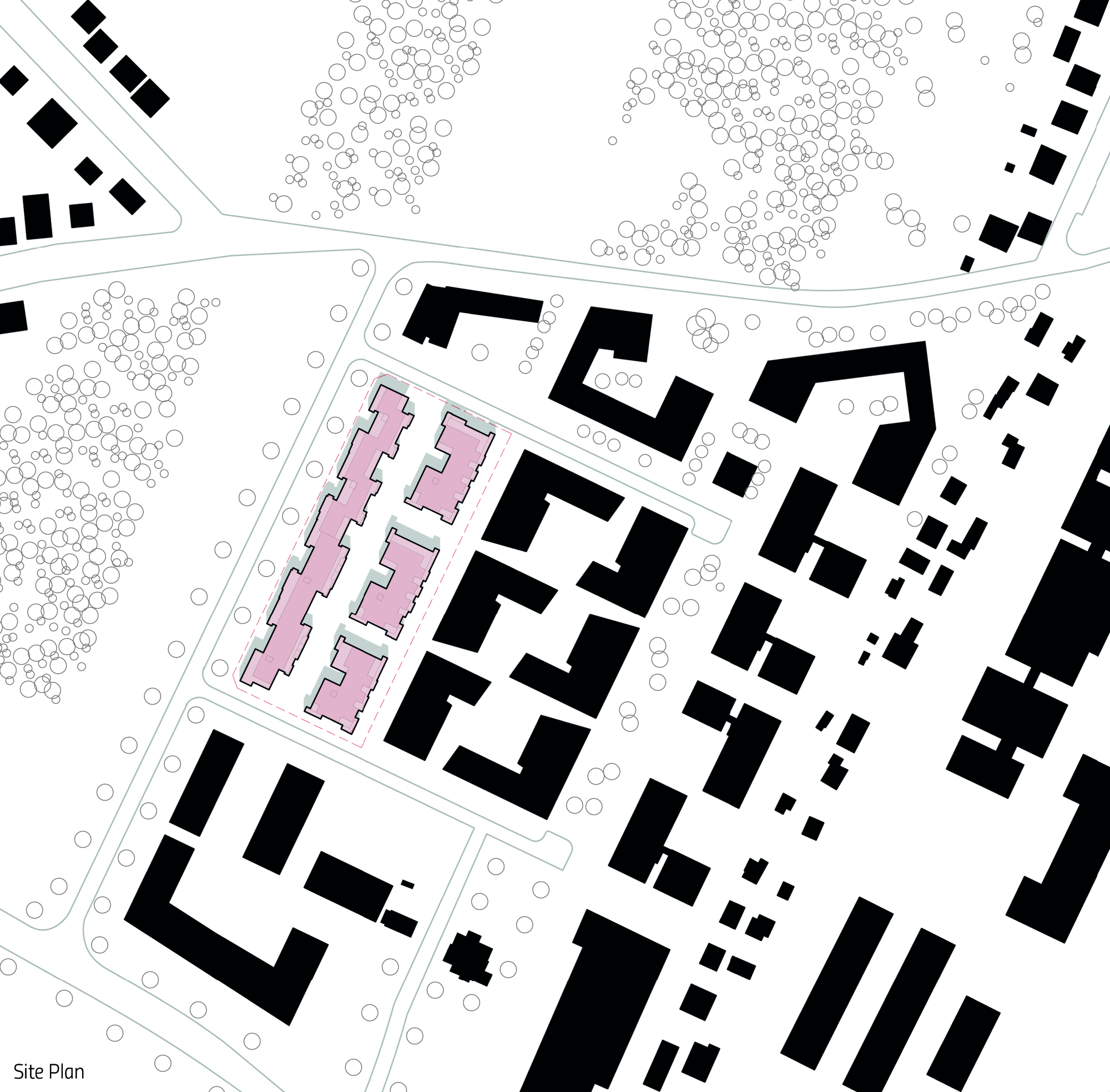 SCH’s parcel was then composed into two layers. The street-front layer is a single thin and articulated block, six stories high in the south, seven in the north. The stairwells are located street side, creating legible entry zones. The living rooms and kitchens face west to the street and towards the view; the bedrooms face east onto a sheltered courtyard. The garden-side layer, to the east of this court, is composed of three compact, five-story blocks.