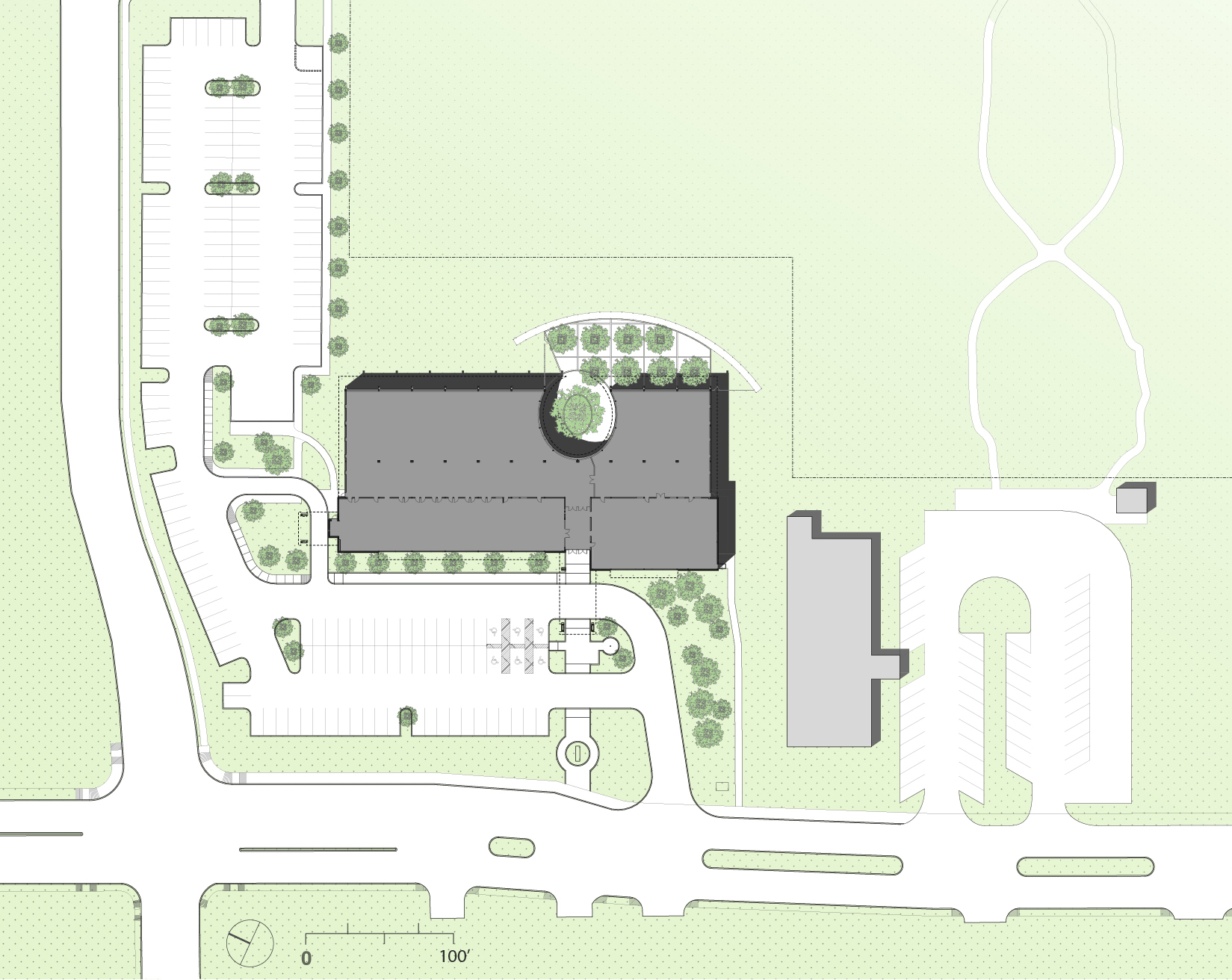 The site, at a major intersection, shares space with a recreation center and a park area to create a new civic center at the heart of the community.