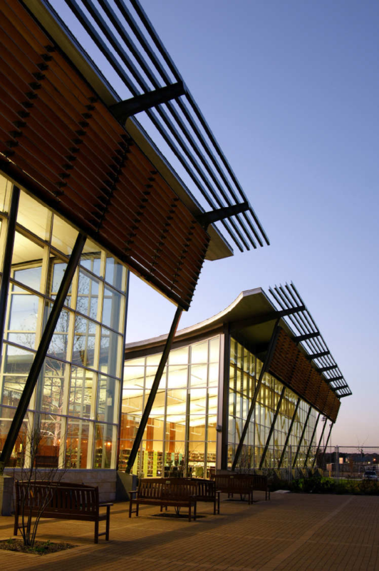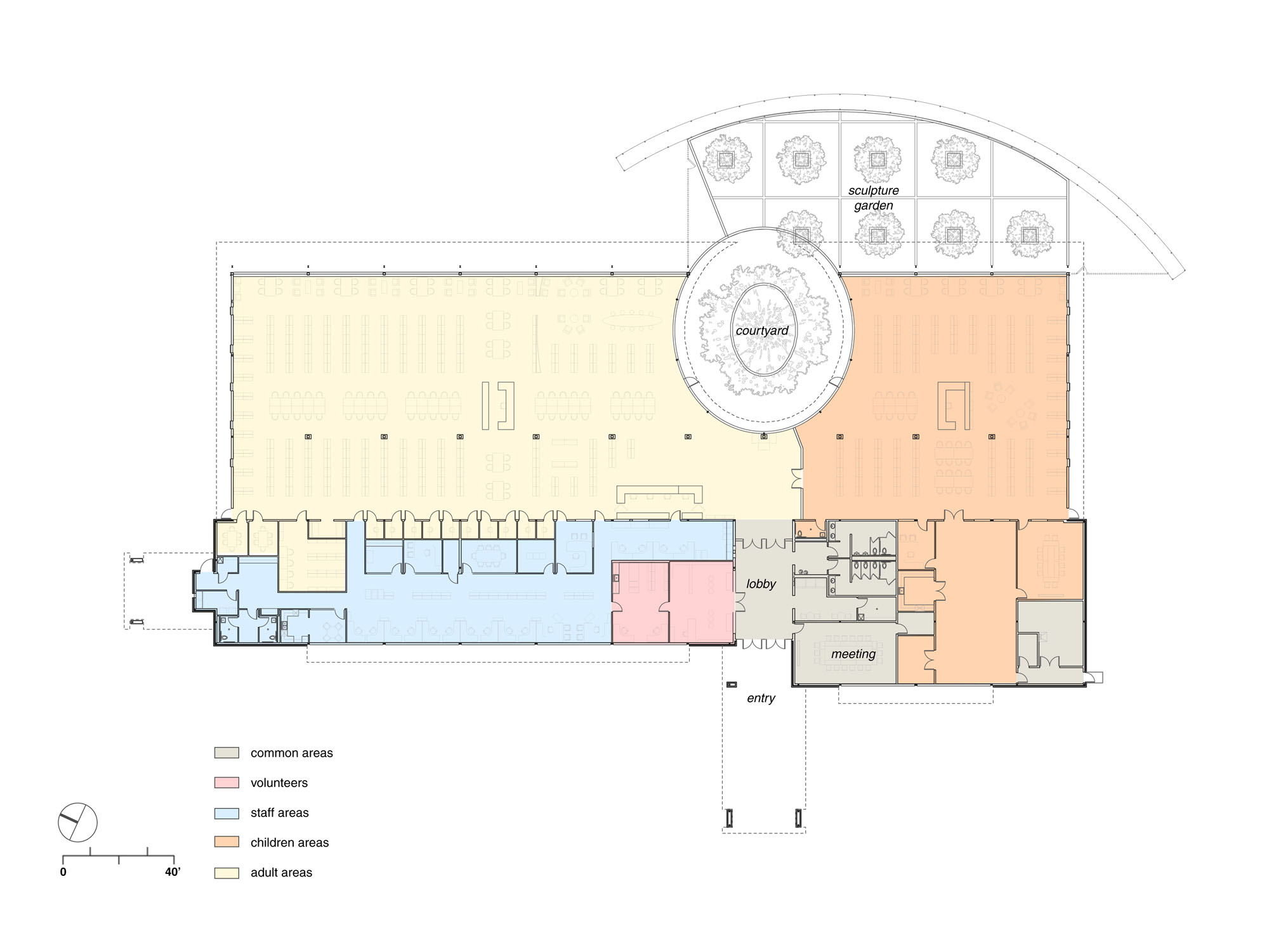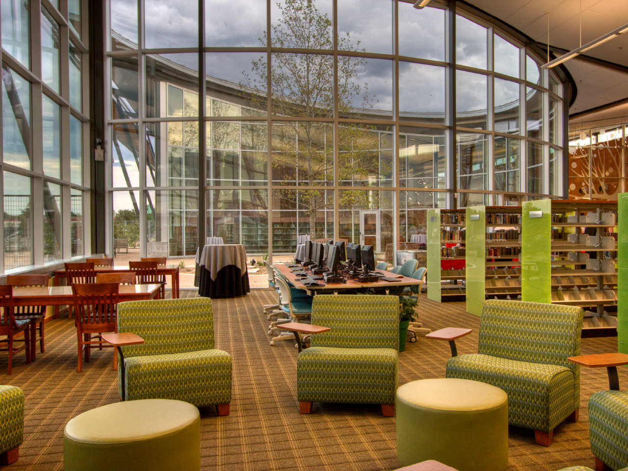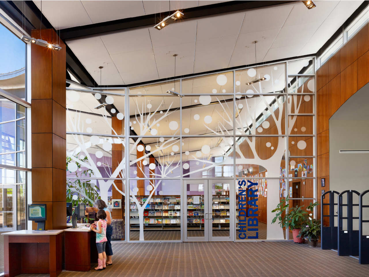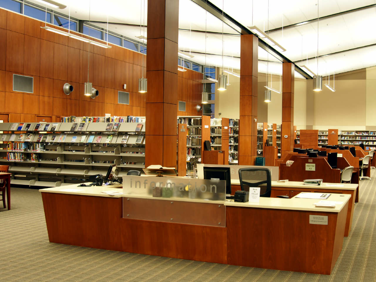 The focus of the public areas is a north-facing glass wall that illuminates the space with indirect natural light and provides views to the library courtyard and the new park area beyond.