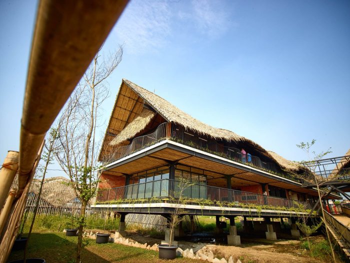 Designed by RAW Architecture, Alfa Omega school is an educational building with the spirit of locality. Located on Tangerang city, it sat on 11700 sqm area with the prior condition of swamp and paddy field. The design responded to this unstable soil condition by raising the structure to 2.1 m high above the ground. The site itself was chosen as part of a design scheme, -corresponding to its natural surroundings, in order to give children a sense of closeness to nature, thus invoking outdoor-learning experience. (The building integrates 4 modular buildings, with an efficient access point in one central courtyard, due to a limitation of local land zoning of what can be built and what cannot be built.) The solution to answer the brief of the project is to create an optimum collaboration or bridge relationship in the economic and creative process of construction in two important levels of masonry steel and bamboo construction which can enrich the economic impact of the surrounding. Steel structure, not only for its ability to hold structural load effectively but is also chosen for its construction speed and vigorous durability. The whole building based on this framework, from foundation to roof component. Steel in its variation from thickness to treatments, opening chances in versatile details of the design. While bamboo, on the other hand, is a flexible matter that requires little maintenance in a long range which always available in that area. This availability also related to brick and concretes in that area.