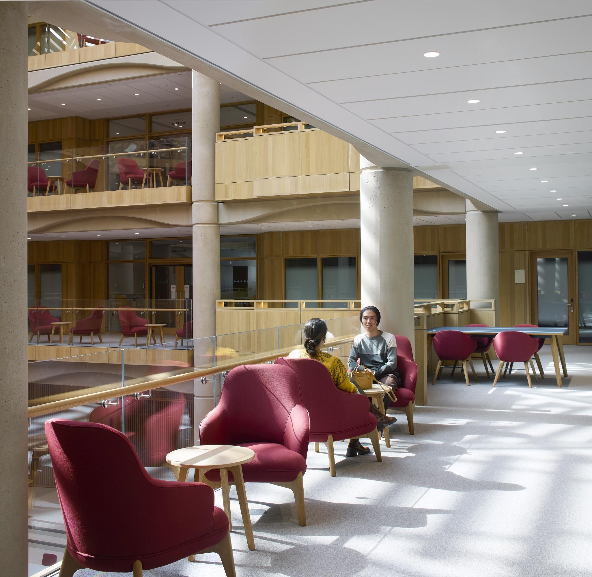 The design prioritizes openness. The public route through the building avoids conventional barriers to entry and is punctuated by public spaces of differing scale and character. At its center lies the Great Hall, a four-story atrium with faculty entrances at its cardinal points, study carrels above, and a domed timber-and-glass skylight bringing light into the space. Flexible enough for exhibitions, lectures, performances, or banquets, it resonates with Oxford’s tradition of civic “rooms” and recalls Hawksmoor’s original vision of a Forum Universitatis.