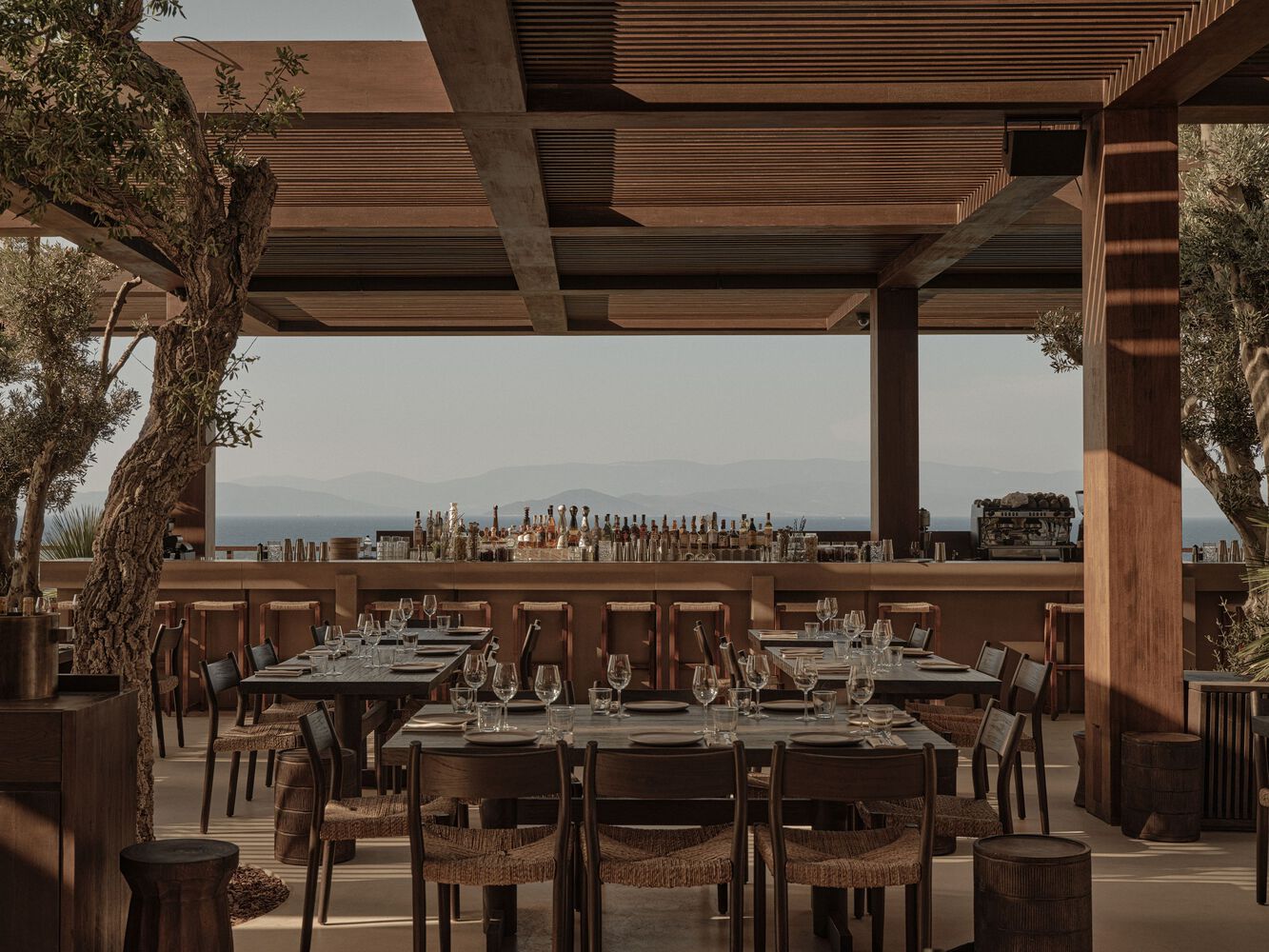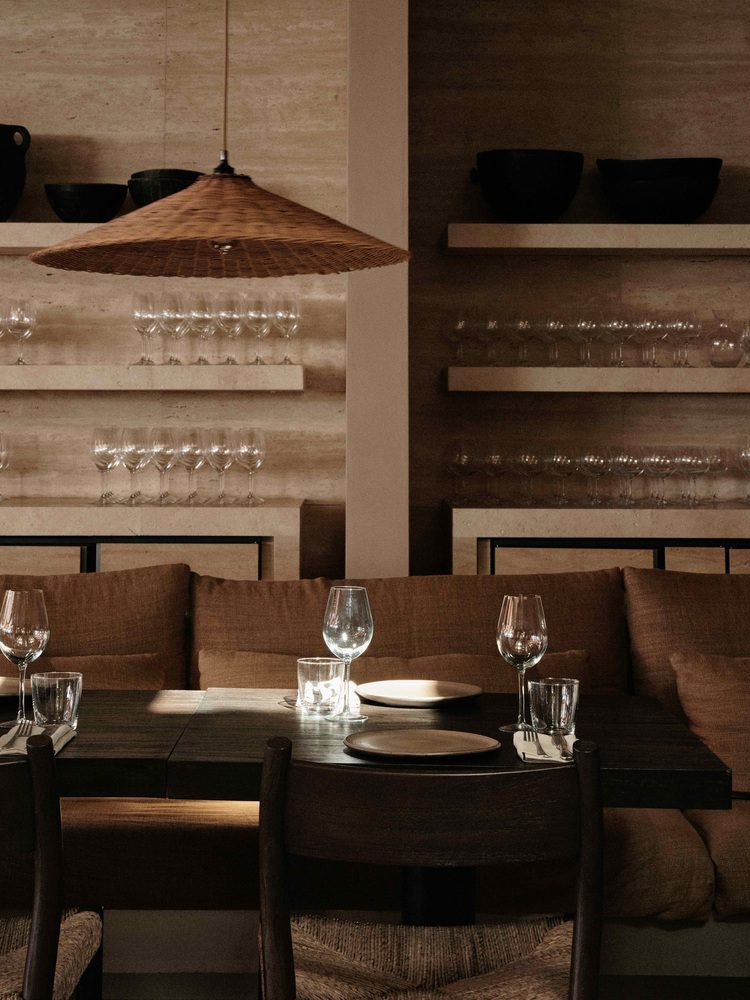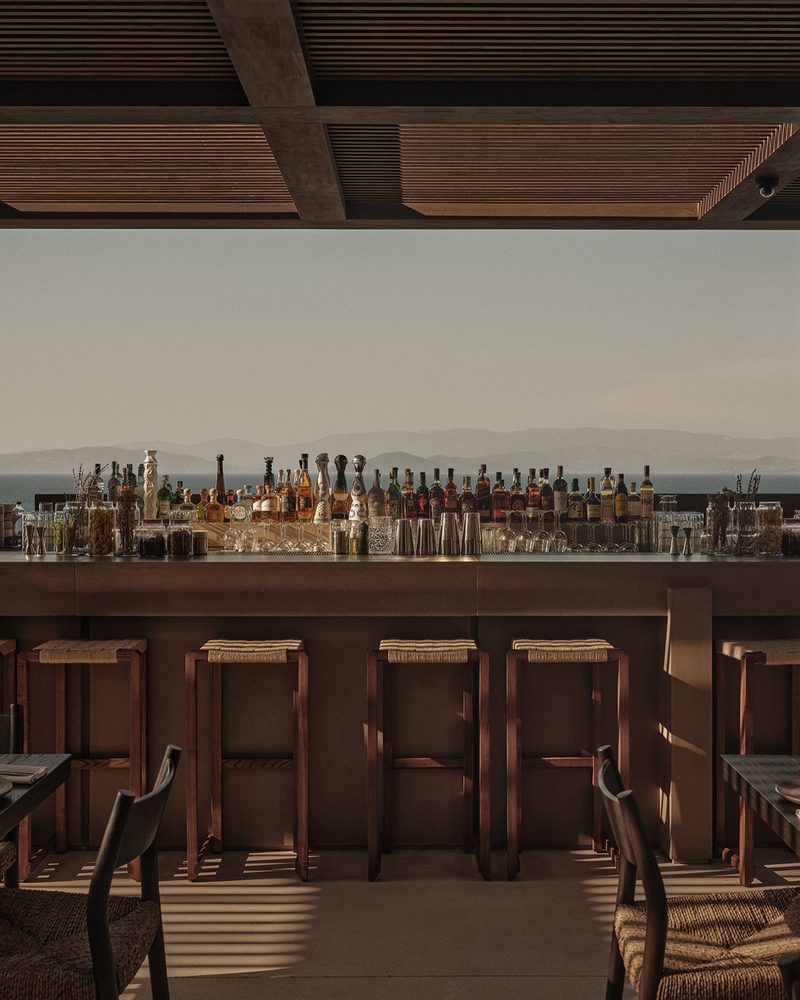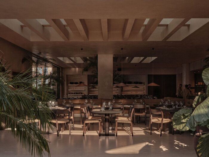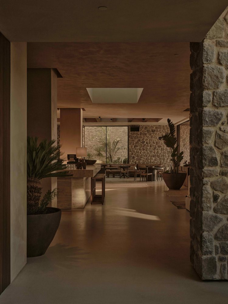 In the restaurant, a brutalist skylight formation is carved out of the ceiling, creating an ethereal atmosphere. The material palette is a harmonious blend of natural render, travertine, and naturally pigmented concrete, exuding a sense of simplicity. Contrasting these elements are the dark timbers, earthy limestones, and bronze found within the kitchen areas, providing a dramatic backdrop for the culinary experience. Large openings divide the space into two distinct experiences, one focusing on the external restaurant area and the other embracing the event terrace with live performances. During the early evening, the warm glow of the sunset floods the space through the large openings, casting warm hues of the sun upon the rear elevation.