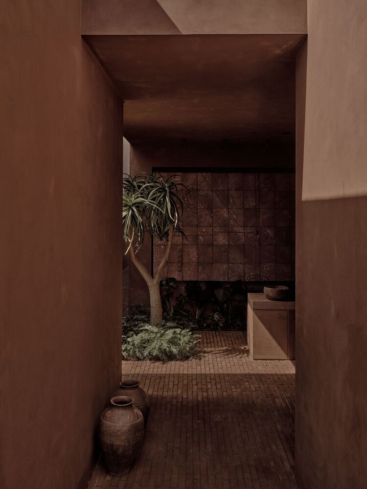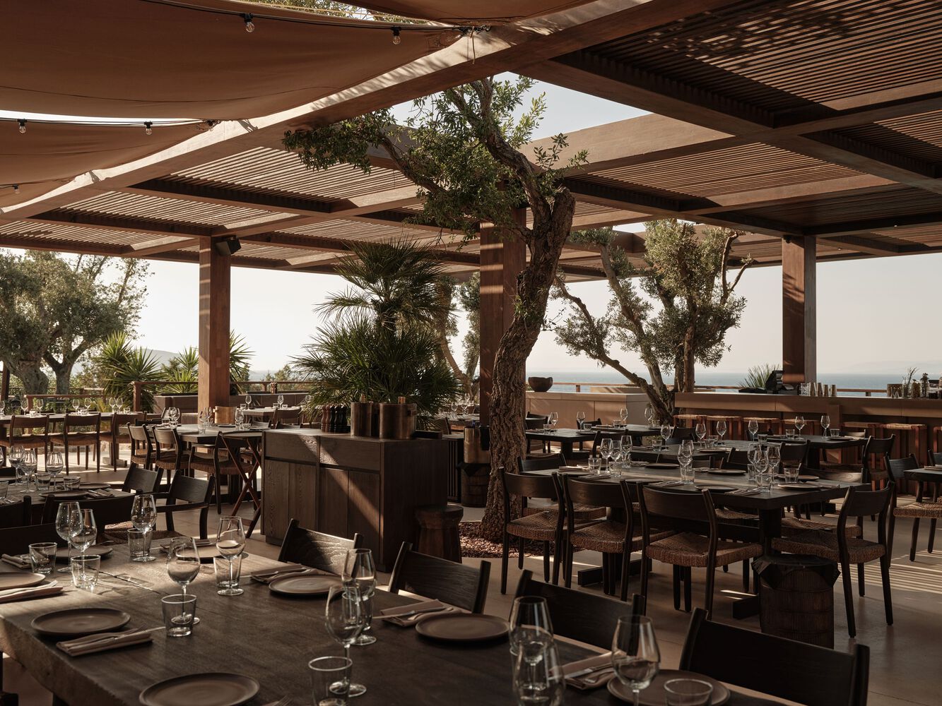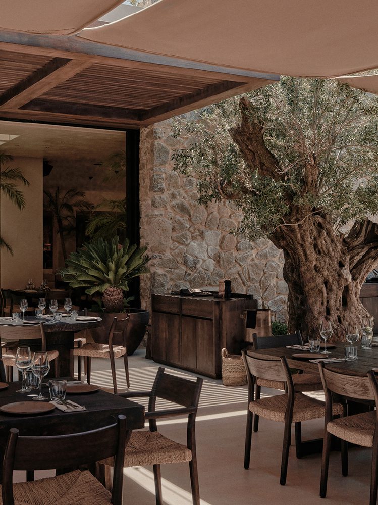 In the restaurant, a brutalist skylight formation is carved out of the ceiling, creating an ethereal atmosphere. The material palette is a harmonious blend of natural render, travertine, and naturally pigmented concrete, exuding a sense of simplicity. Contrasting these elements are the dark timbers, earthy limestones, and bronze found within the kitchen areas, providing a dramatic backdrop for the culinary experience. Large openings divide the space into two distinct experiences, one focusing on the external restaurant area and the other embracing the event terrace with live performances. During the early evening, the warm glow of the sunset floods the space through the large openings, casting warm hues of the sun upon the rear elevation.