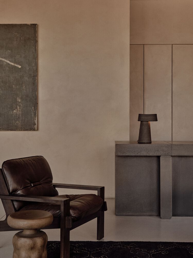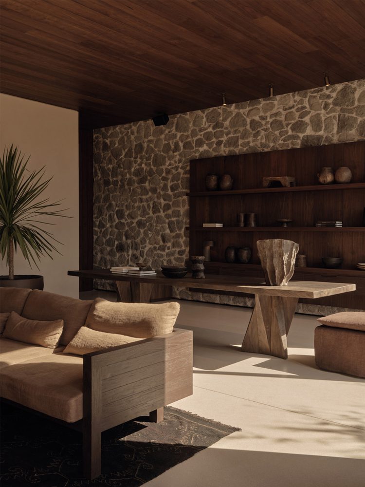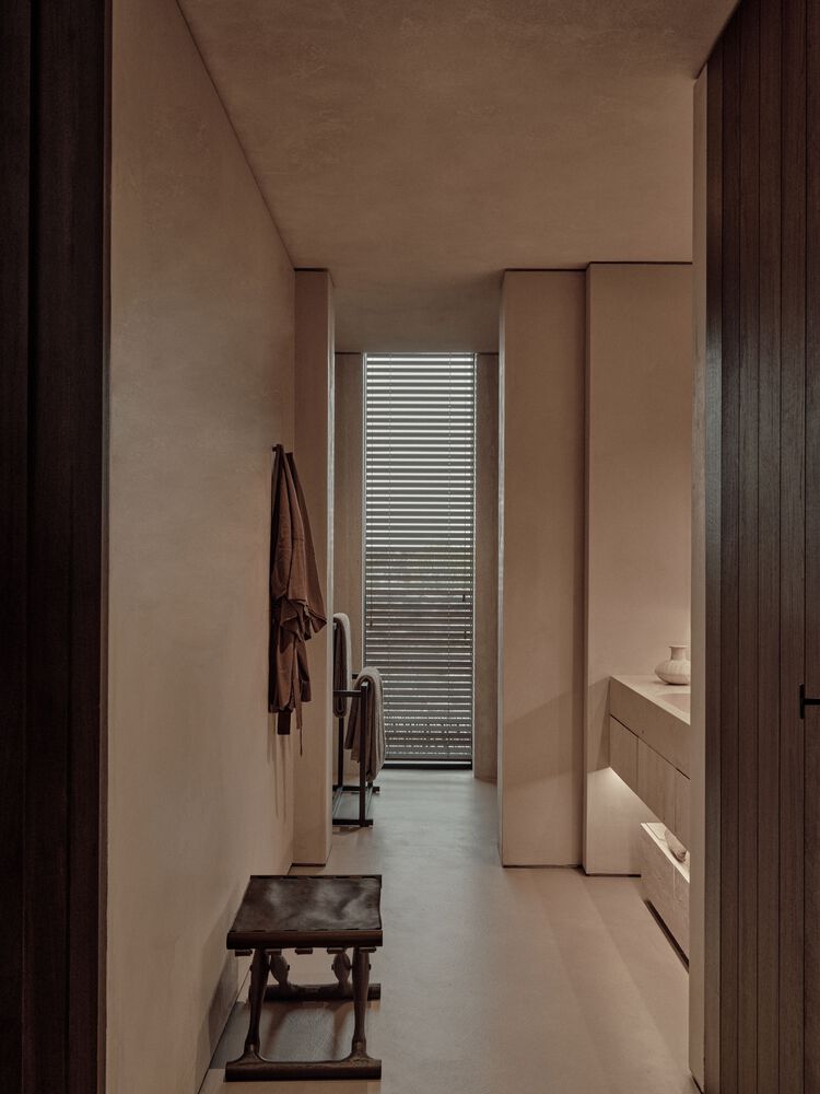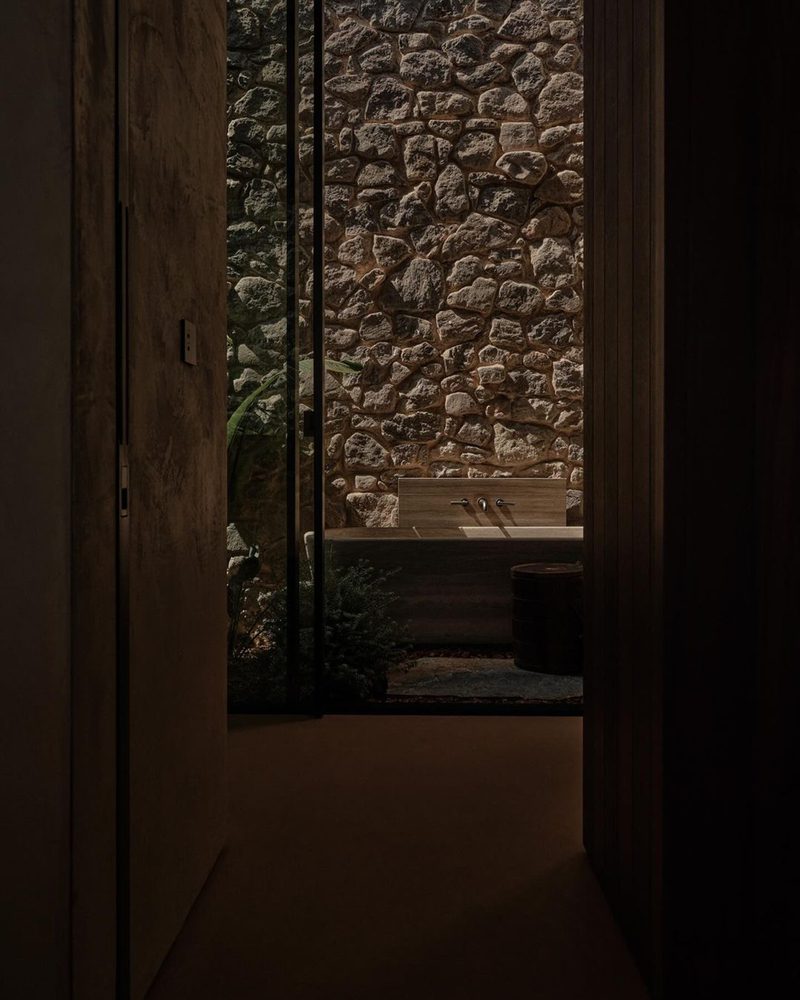 Through a sliding timber door concealed within the back timber wall, guests enter the en-suite, connected to an outdoor courtyard featuring a bespoke bath. The bath, carved from a single solid piece of warm Greek grey marble, seamlessly blends with the stone walls of the courtyard, surrounded by lush plantations. This extension allows natural light to flood the space, enhancing the bathing experience. The harmonious tone-on-tone palette incorporates natural plaster, sandblasted, and raked travertine, adding depth and texture.