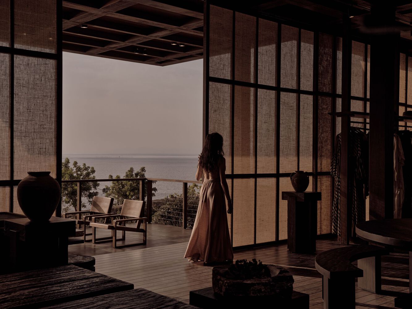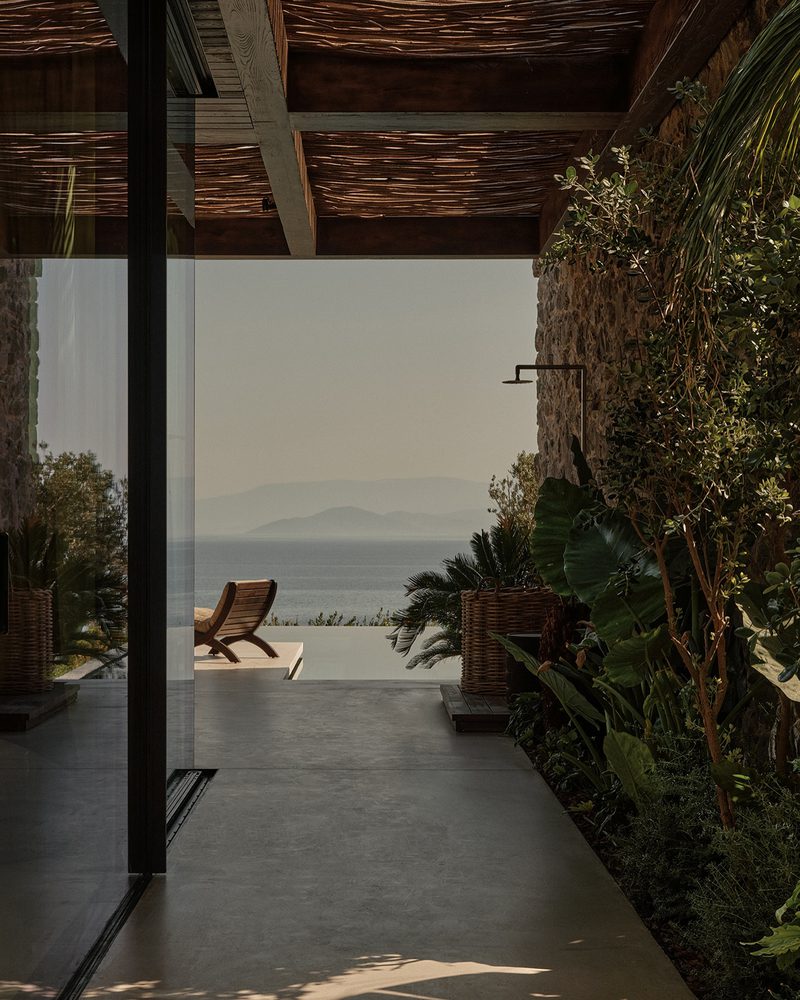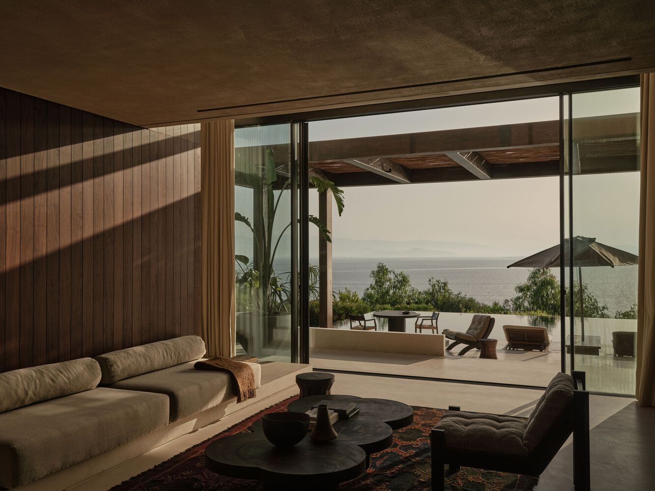 The bungalows with dedicated arrival reception lounge, sit proudly atop the hill, radiating around the peninsula, giving a variety of different sea views from each room. Two varieties of bungalows are available, with a single floor or mezzanine option for those who desire more capacity for guests. Both feature large terraces with either building canopies or pergolas for shade. Guests can cool down in the expansive 100 sqm pools. The space’s distinguishing feature is a timber back wall that envelops and extends in front of the stone walls. It conceals wardrobes, luggage storage, full-length mirrors, and a built-in timber day bed. This approach provides all necessary amenities while maintaining a calm, modest aesthetic, minimizing visual clutter and allowing guests to focus on the beautiful views offered by the glazed fenestration on two sides. Conversely, a travertine block cleverly conceals the mini-bar and pantry.