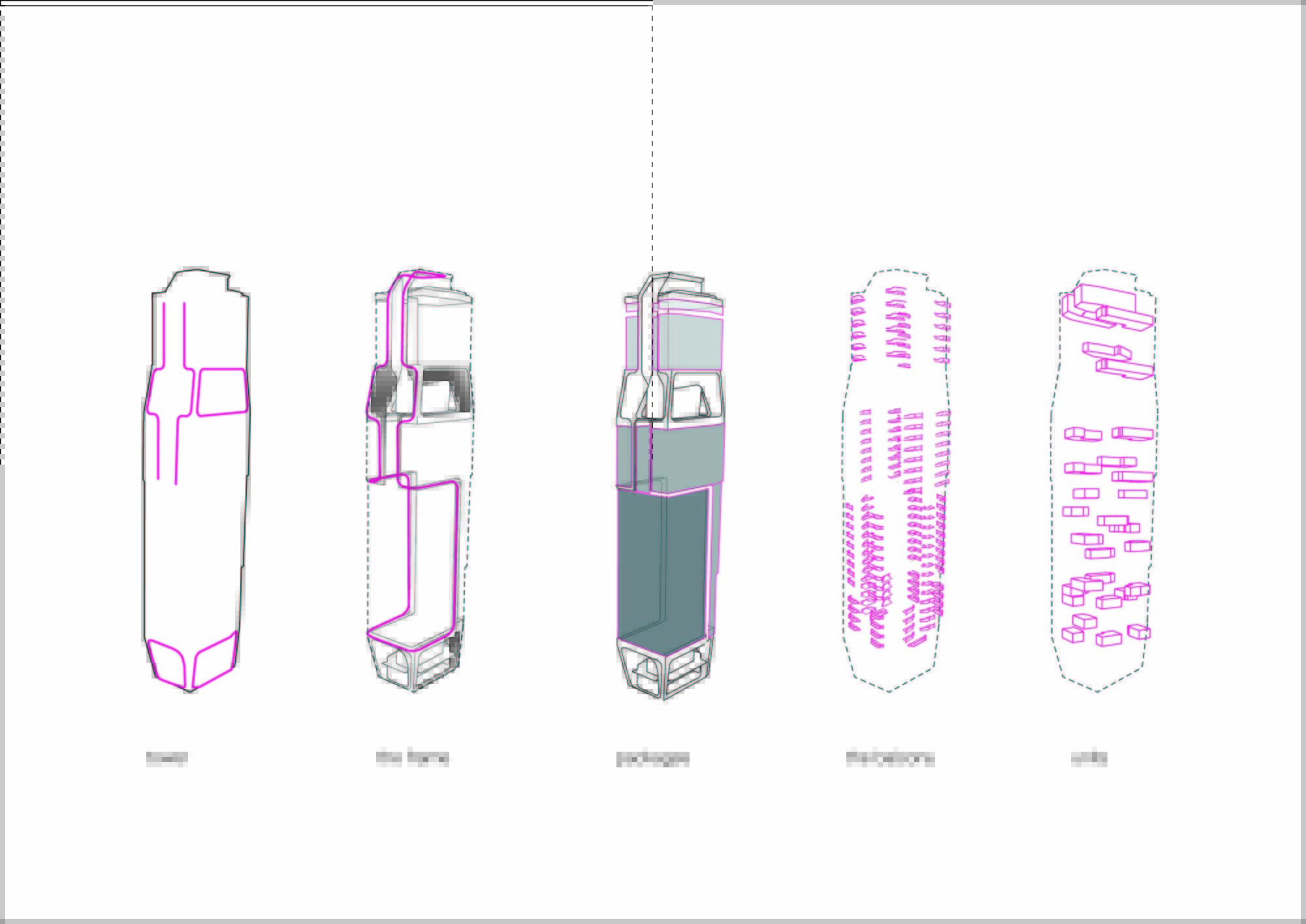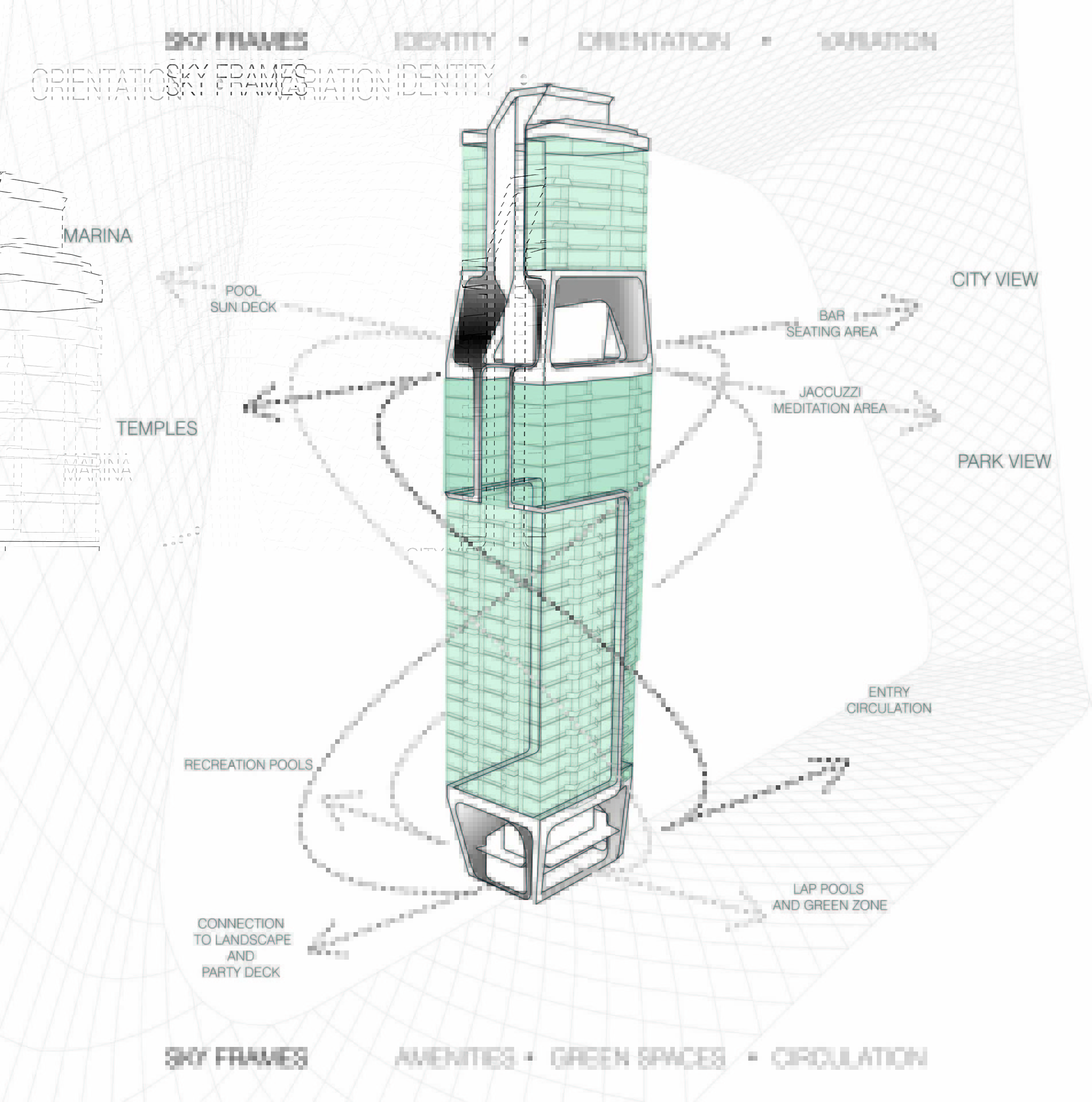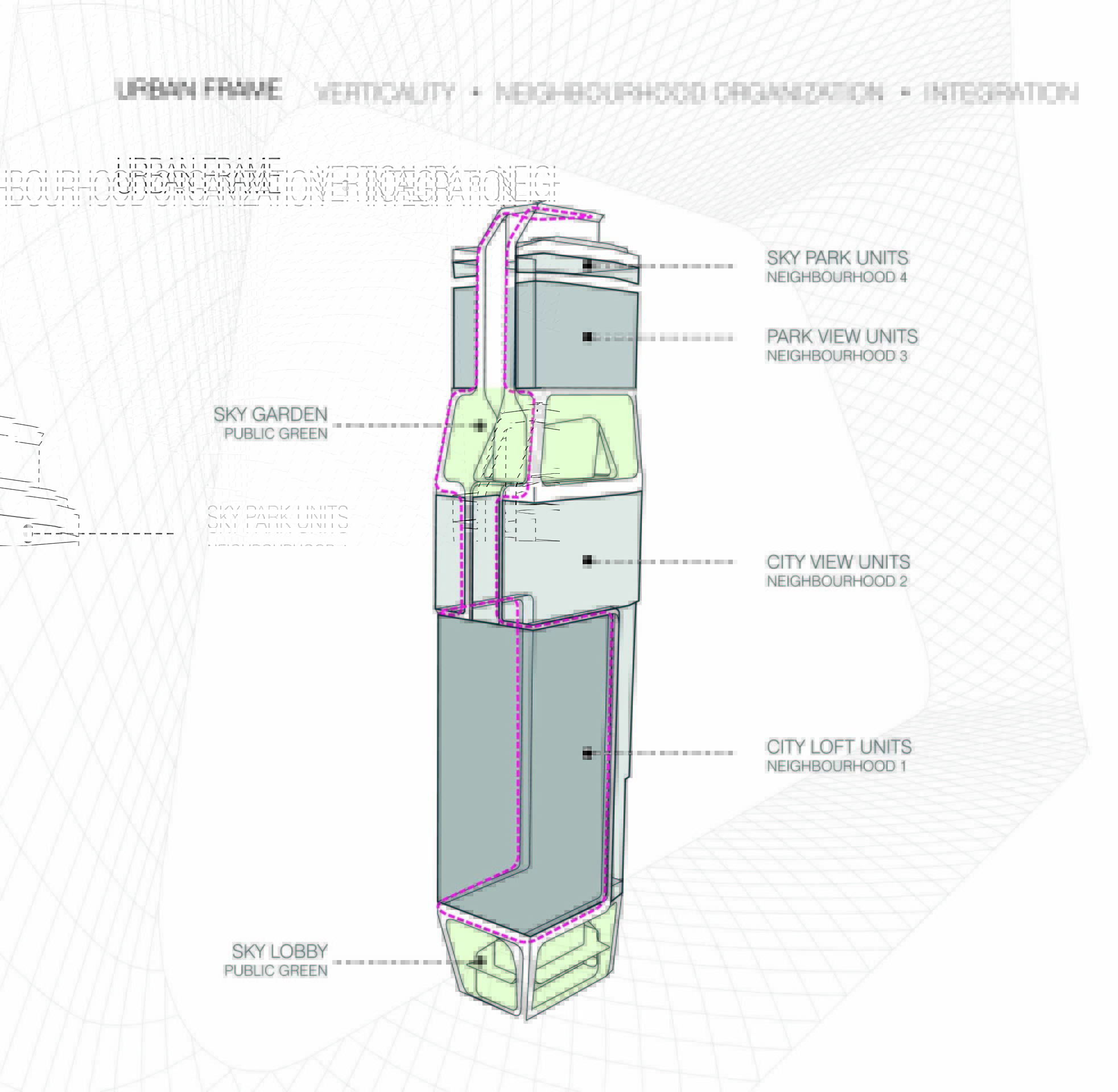 The vertical city concept along with the green areas are bound together by two gestures: the ‘vertical frame’ and the ‘sky frames.’ The vertical frame organises the tower in an urban manner. It unites the tower into one ‘vertical city’, but also provides clear distinctions between the four residential clusters, providing the neighbourhood effect.