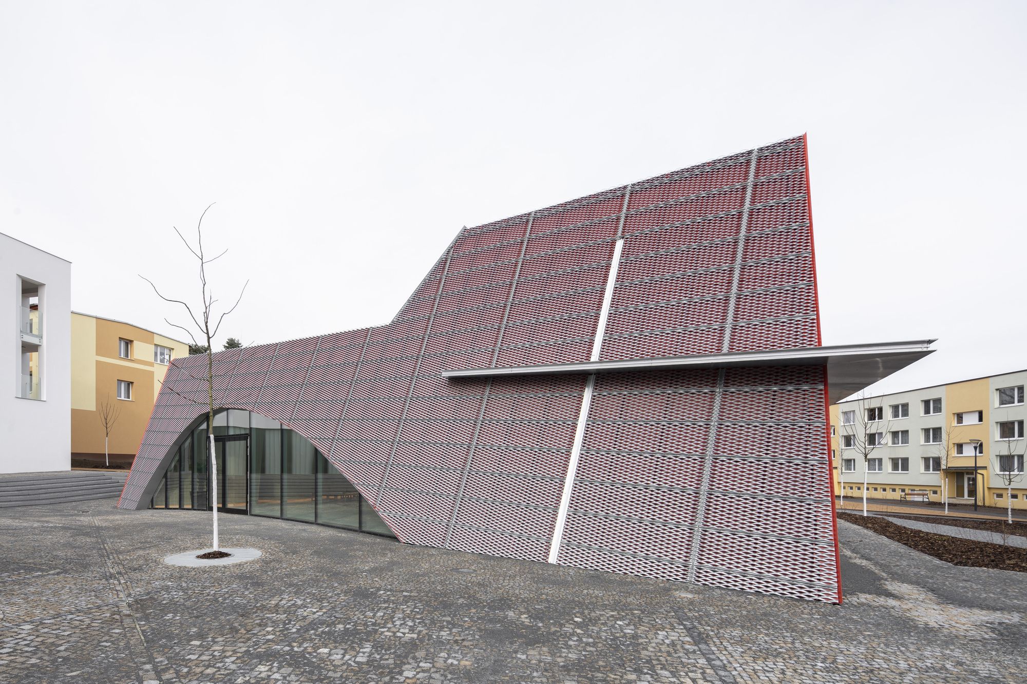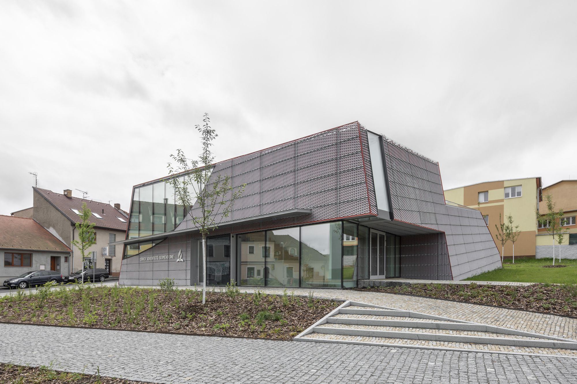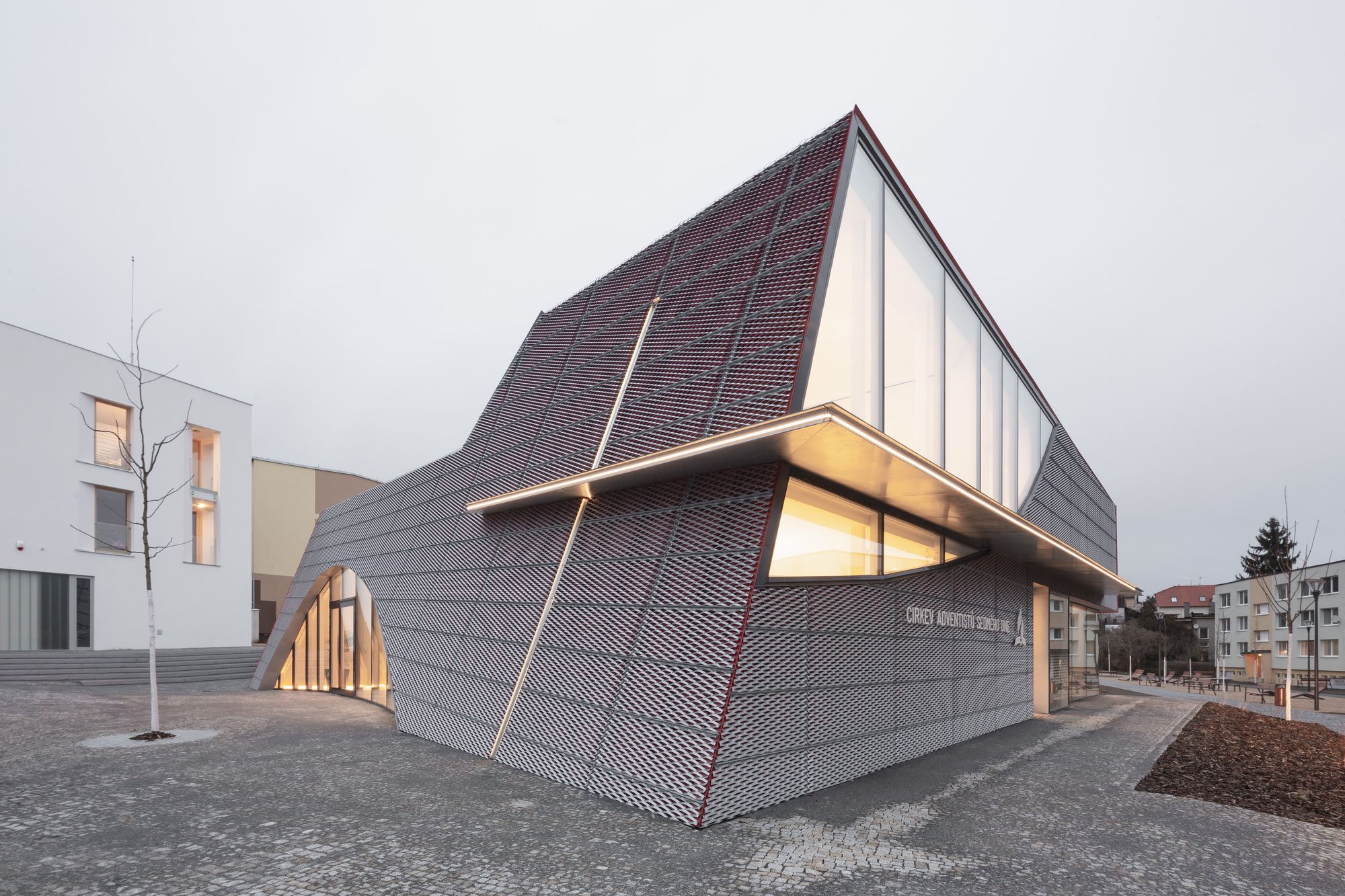 The house of prayer’s shape builds on the intersection of a crystalline form and organic shape of the curve. The solid form composed of individual planes and lines fixed into the ground symbolizes the limited space of life. A curve as a soft organic element represents the spontaneity and dynamics of life – a curve that disbalances us from the solid form. The spiritual dimension of the building’s character is expressed by the vertical composition of the light, generous glazed areas above the rostrum. From the structural point of view, the house of prayer consists of three concrete slabs leaning against each other. Its façade is made of expanded sheet metal. A red foil is placed below the sheets creating the final colour effect. The house of prayer changes its colour during daytime depending on the intensity and direction of sunlight. The colour scheme is also affected by the distance from the house of prayer. When we are close to it, we perceive the red colour more; when we walk away, the silver colour takes over.