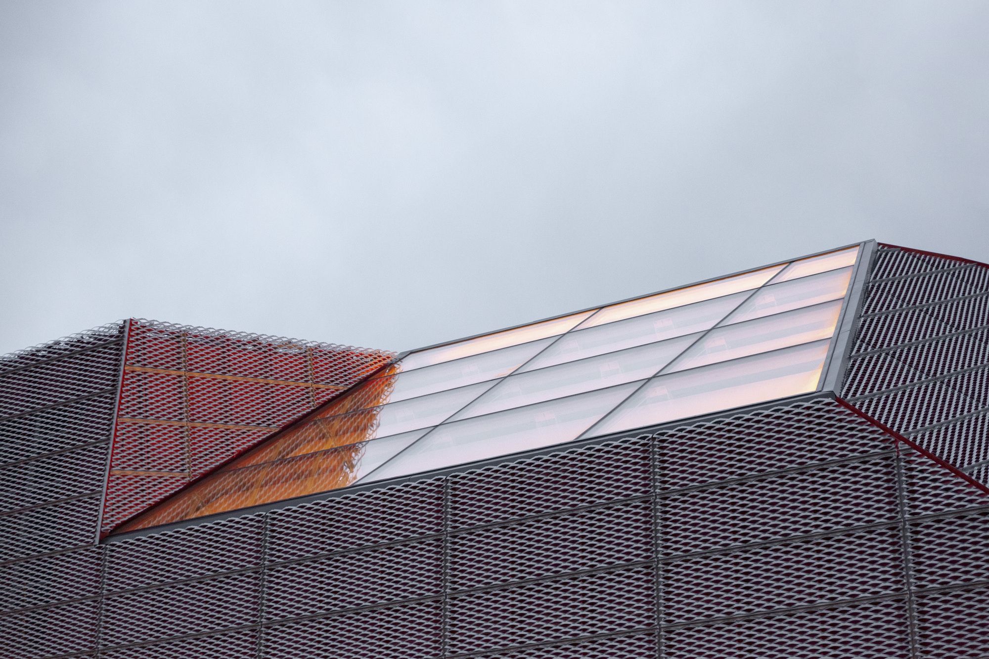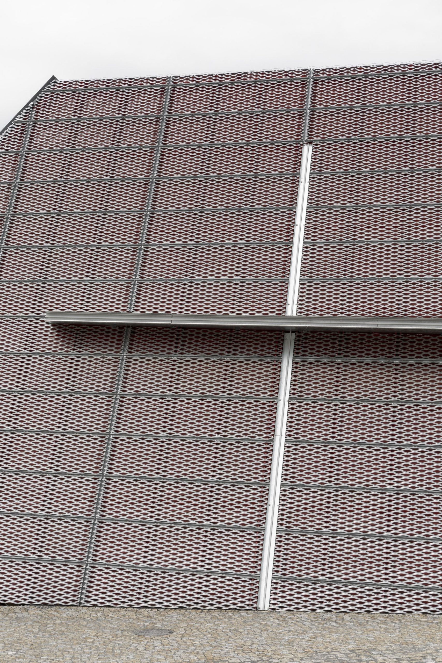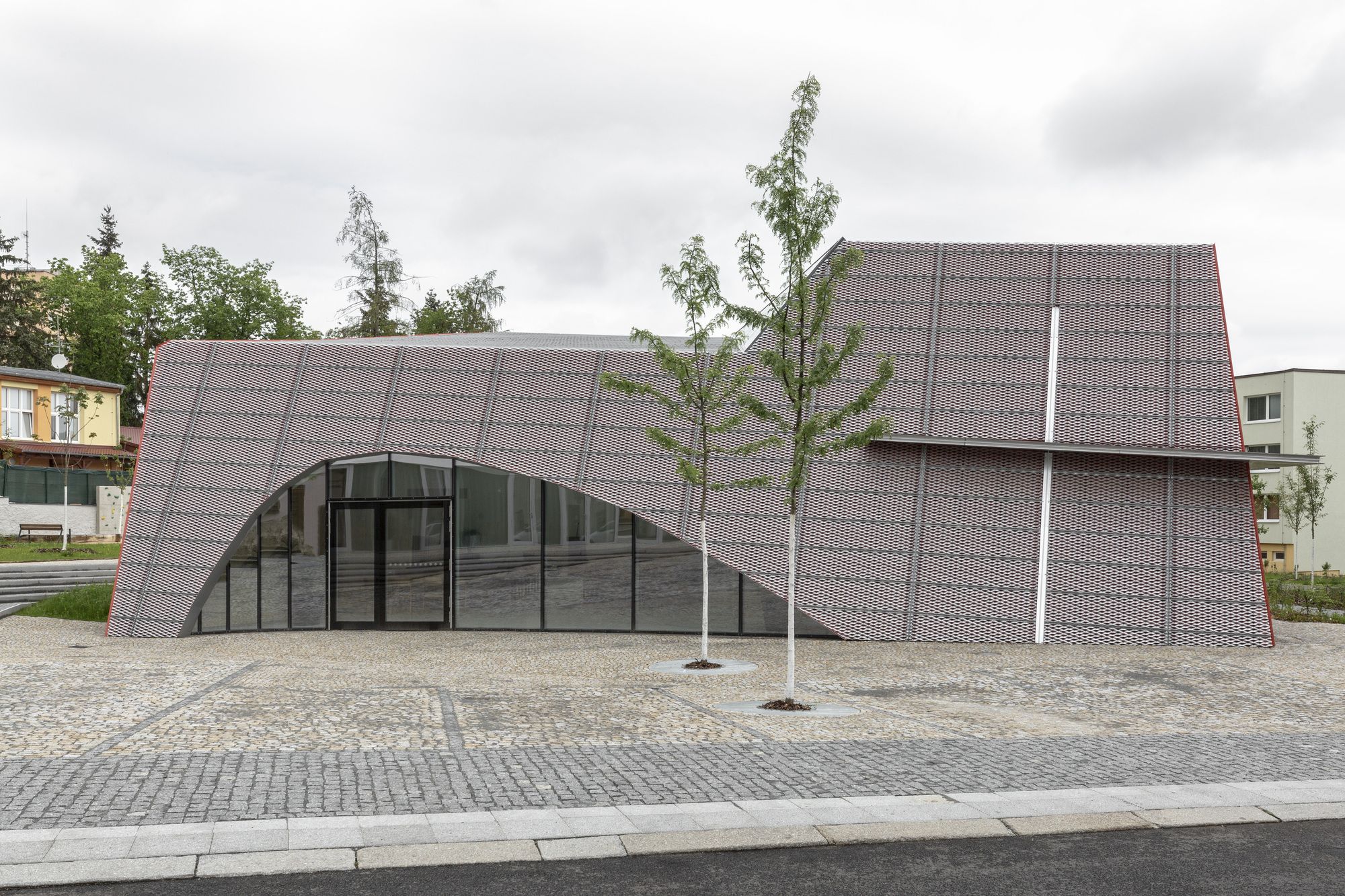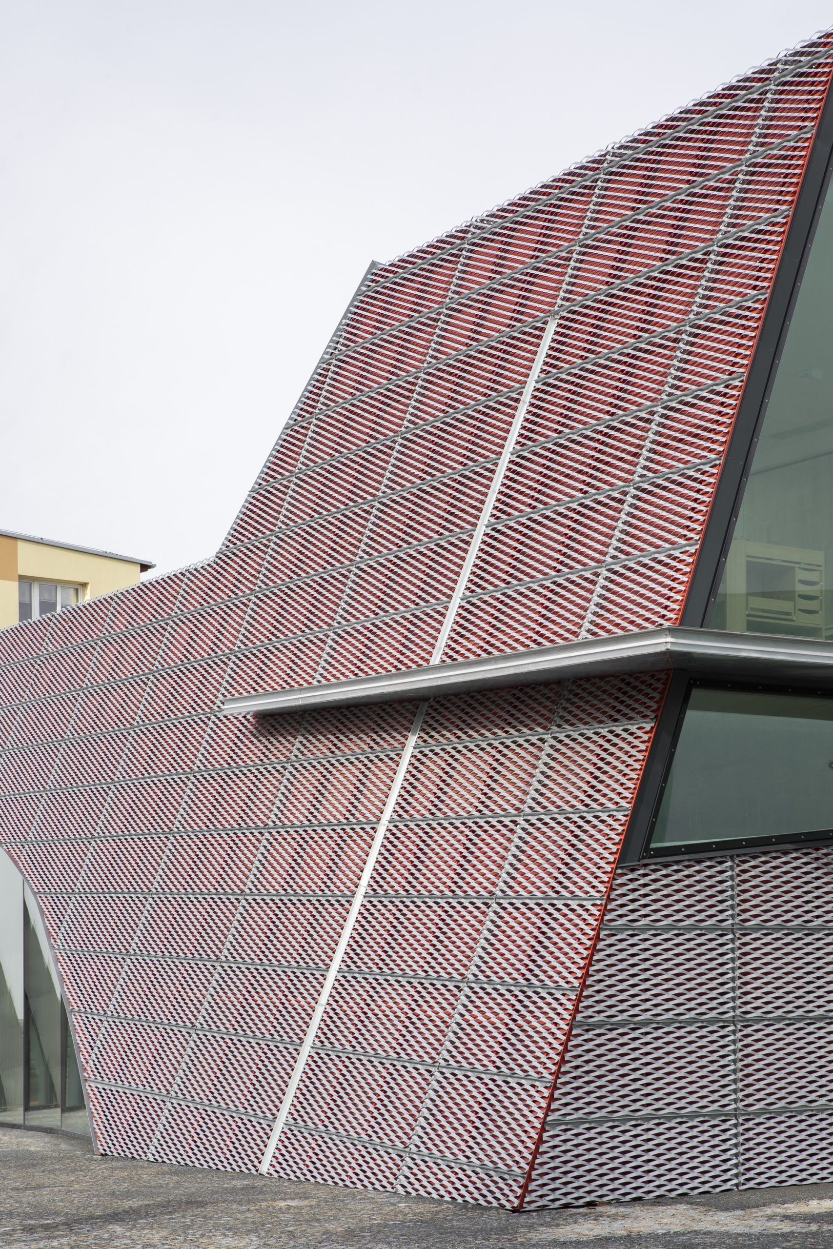 The house of prayer’s shape builds on the intersection of a crystalline form and organic shape of the curve. The solid form composed of individual planes and lines fixed into the ground symbolizes the limited space of life. A curve as a soft organic element represents the spontaneity and dynamics of life – a curve that disbalances us from the solid form. The spiritual dimension of the building’s character is expressed by the vertical composition of the light, generous glazed areas above the rostrum. From the structural point of view, the house of prayer consists of three concrete slabs leaning against each other. Its façade is made of expanded sheet metal. A red foil is placed below the sheets creating the final colour effect. The house of prayer changes its colour during daytime depending on the intensity and direction of sunlight. The colour scheme is also affected by the distance from the house of prayer. When we are close to it, we perceive the red colour more; when we walk away, the silver colour takes over.