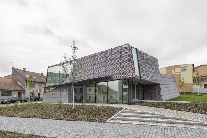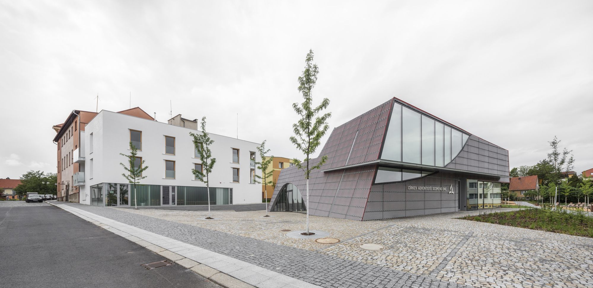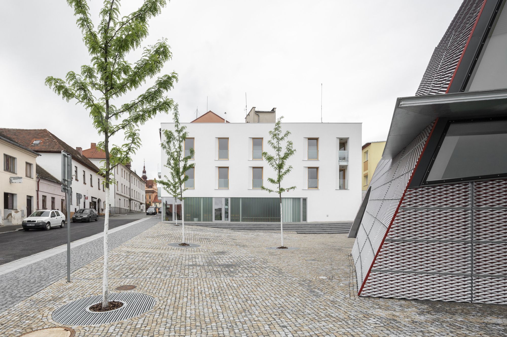 Sedlčany Community Centre is situated close to the historic centre of Sedlčany in Central Bohemia, south of Prague. It consists of two buildings establishing a natural transition between the town’s historic block structure and the less densely developed area. The tenement house ends the street line establishing a corner. The point of gravity of the slightly stepped-back house of prayer is rotated towards the town’s centre closing and orienting the new municipal park at the same time. Two different approaches are used for the tenement house and the house of prayer; the more traditionally conceived tenement house is by its expression and composition conforms to the house of prayer establishing a quality space for it. It is designed as a simple or even modest form referring to the distinct shape of the house of prayer by its inclining plane in the back section.