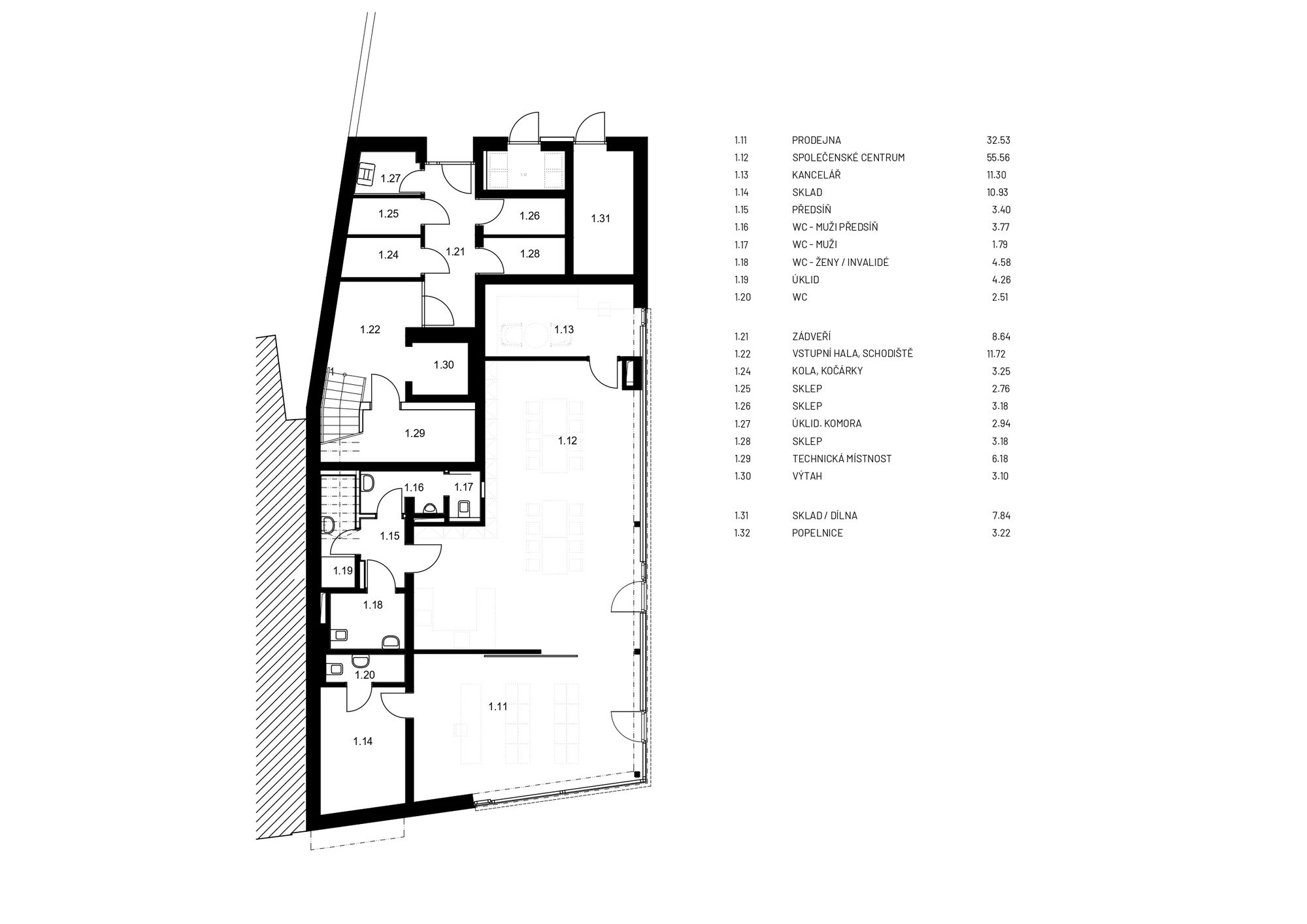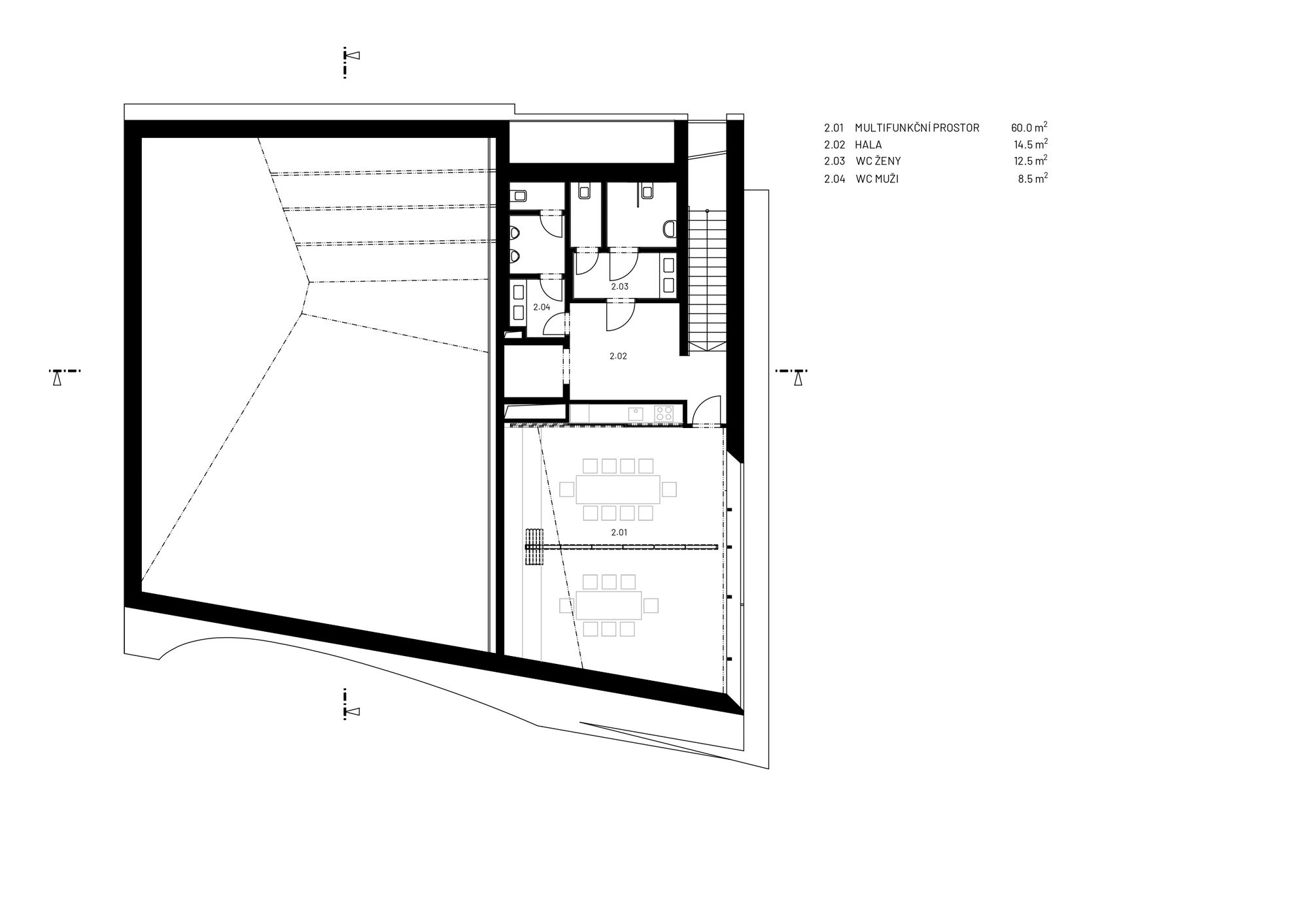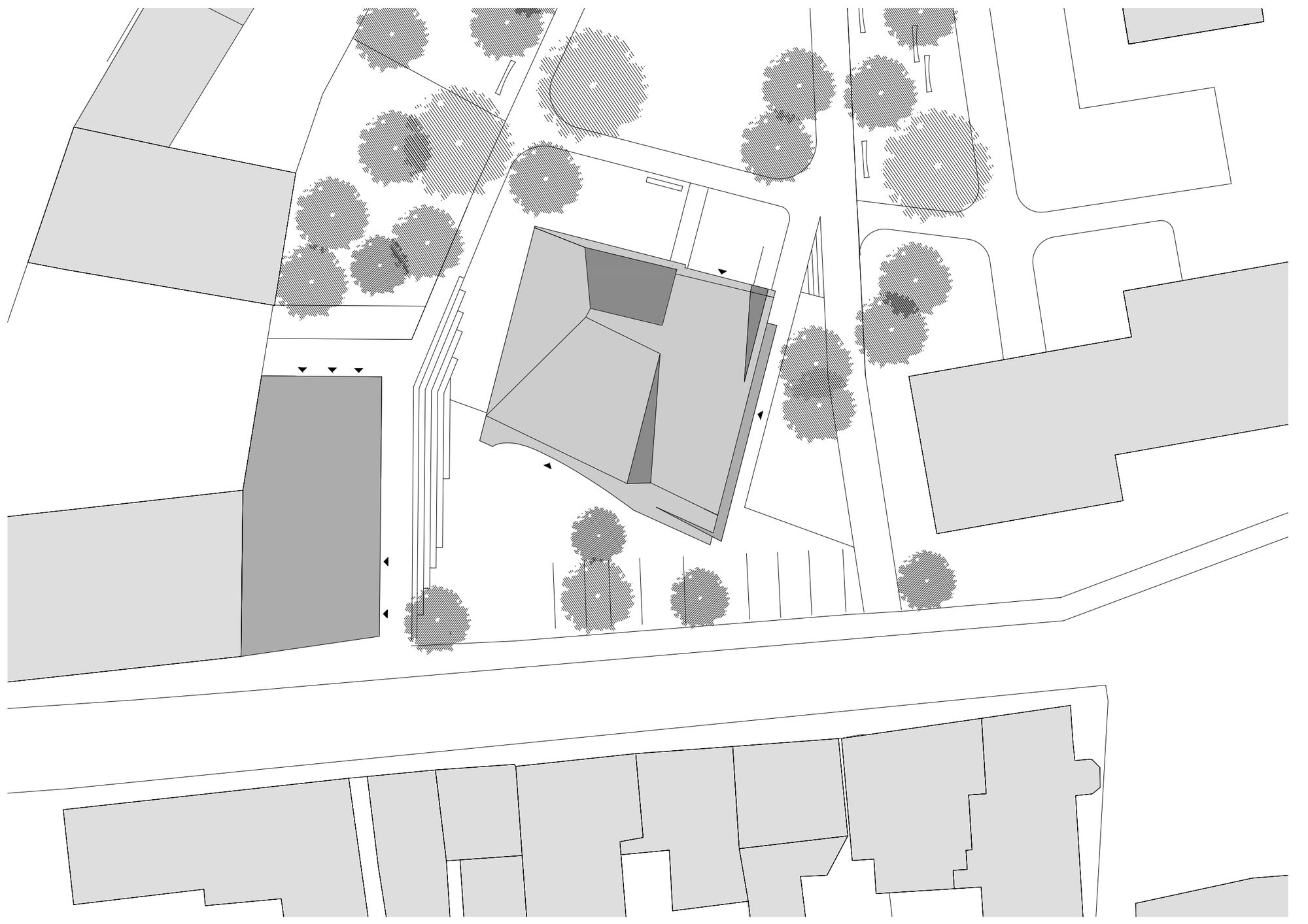 Sedlčany Community Centre is situated close to the historic centre of Sedlčany in Central Bohemia, south of Prague. It consists of two buildings establishing a natural transition between the town’s historic block structure and the less densely developed area. The tenement house ends the street line establishing a corner. The point of gravity of the slightly stepped-back house of prayer is rotated towards the town’s centre closing and orienting the new municipal park at the same time. Two different approaches are used for the tenement house and the house of prayer; the more traditionally conceived tenement house is by its expression and composition conforms to the house of prayer establishing a quality space for it. It is designed as a simple or even modest form referring to the distinct shape of the house of prayer by its inclining plane in the back section.