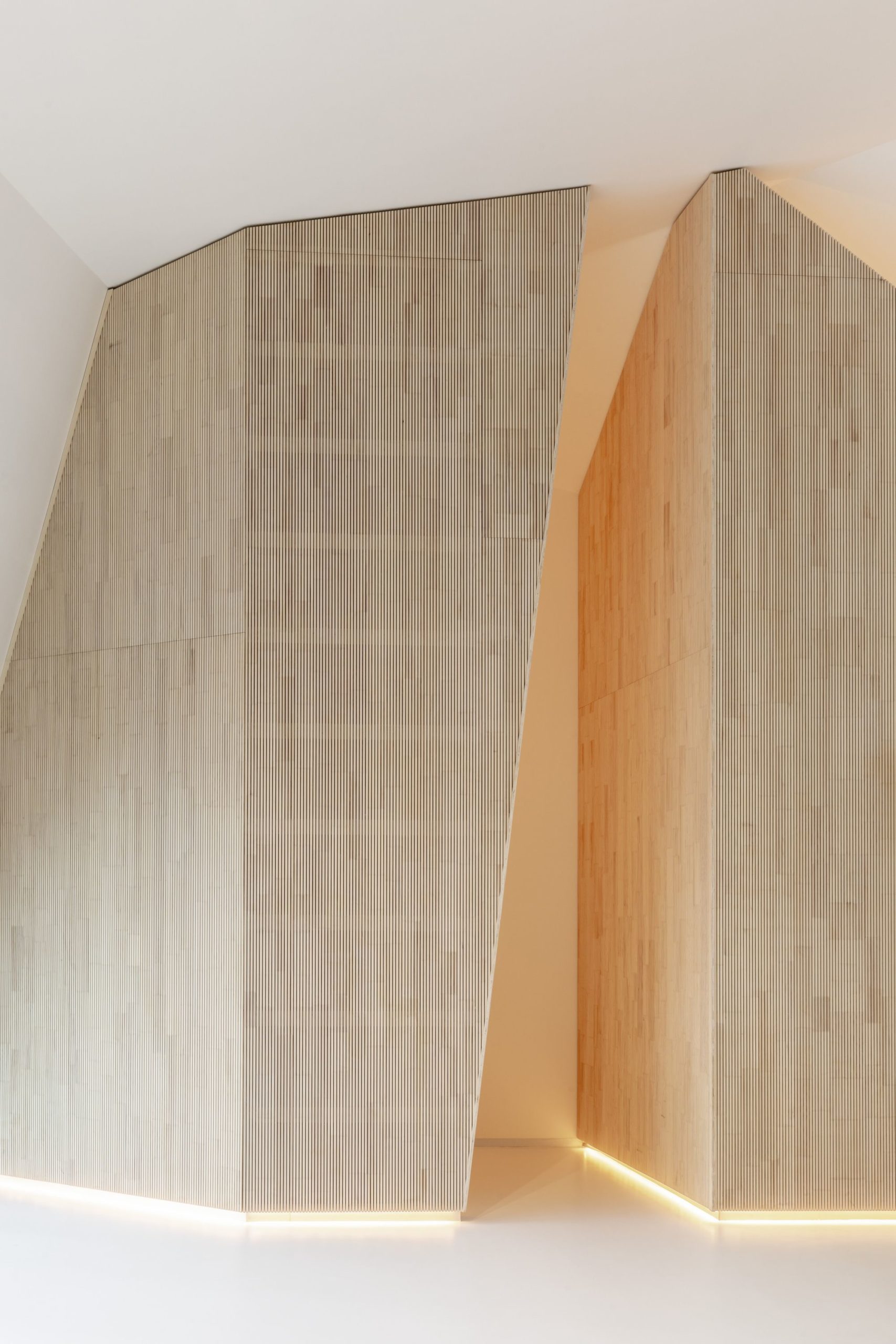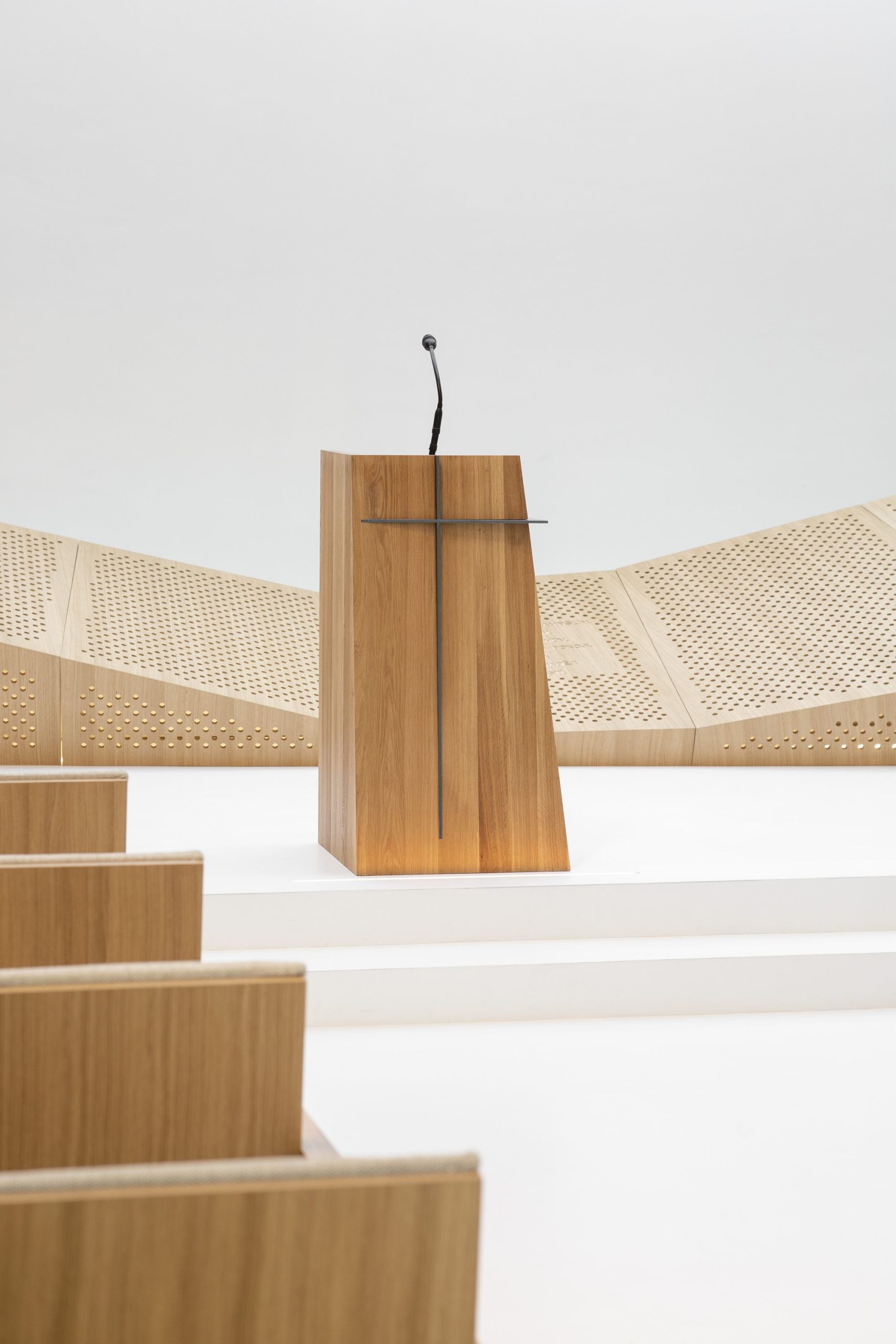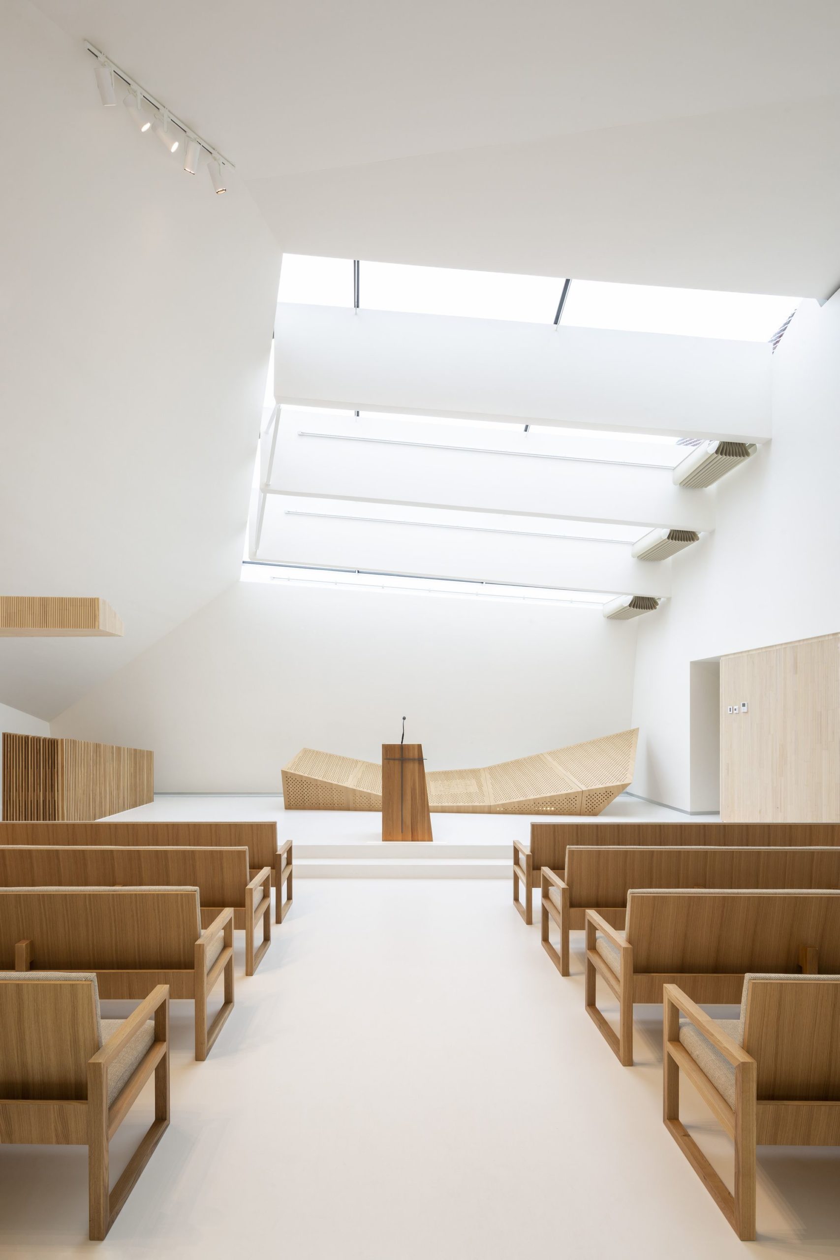 Contrary to that, the generously designed ceremonial entrance in the back part of the main hall expresses the openness of the space, removing the barrier between the exterior and the interior. Selected materials emphasize the house of prayer’s atmosphere. The combination of white areas of the floor, walls, and the ceiling, and the light wood in the interior contrasts with the outer appearance. The selected timber cladding provides for good acoustics of the main hall. It contains concealed soundwave-absorbing layers. Ventilation and cooling technology are placed below the acoustic cladding.