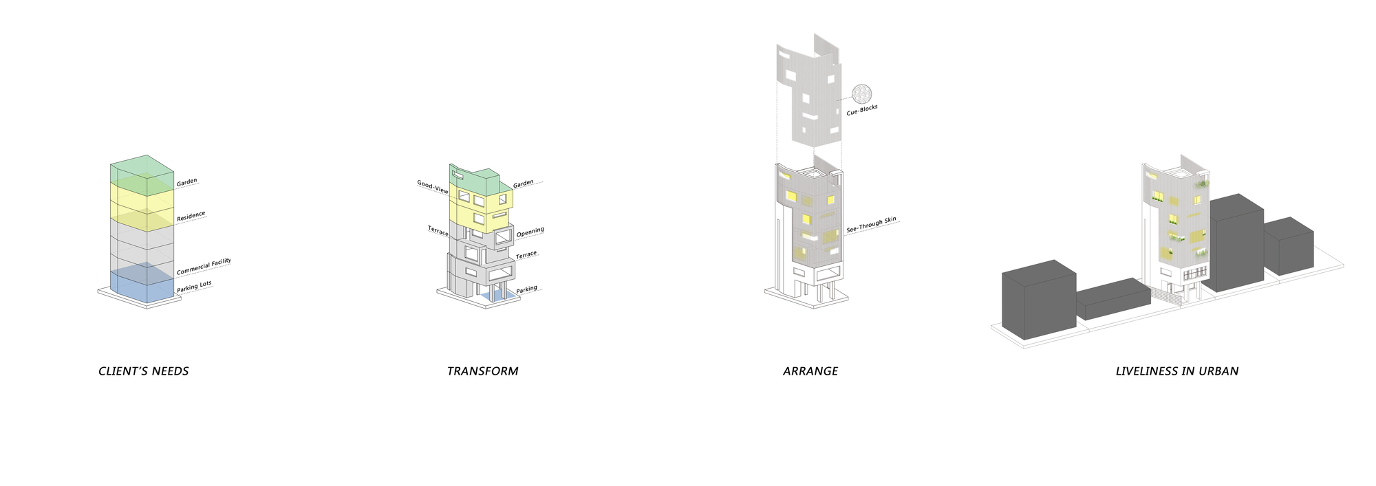 The building is an individual property but at the same time plays a public role in creating the urban environment. It is also the architect’s issue to find alternatives that can satisfy both of these attributes. We needed a device to properly connect these two attributes and suggested skins to cover the building. The skin we propose is neither fully open nor fully closed. Opaque skins filter the urban space and private space obscurely and serve as mediators to create non-conflicting relationships.