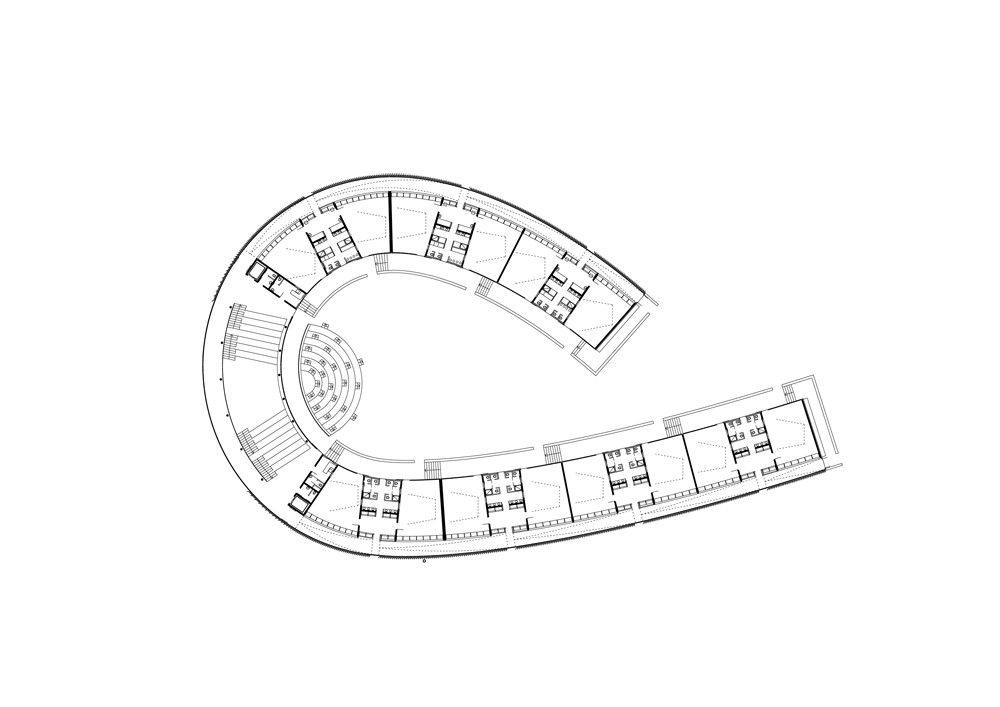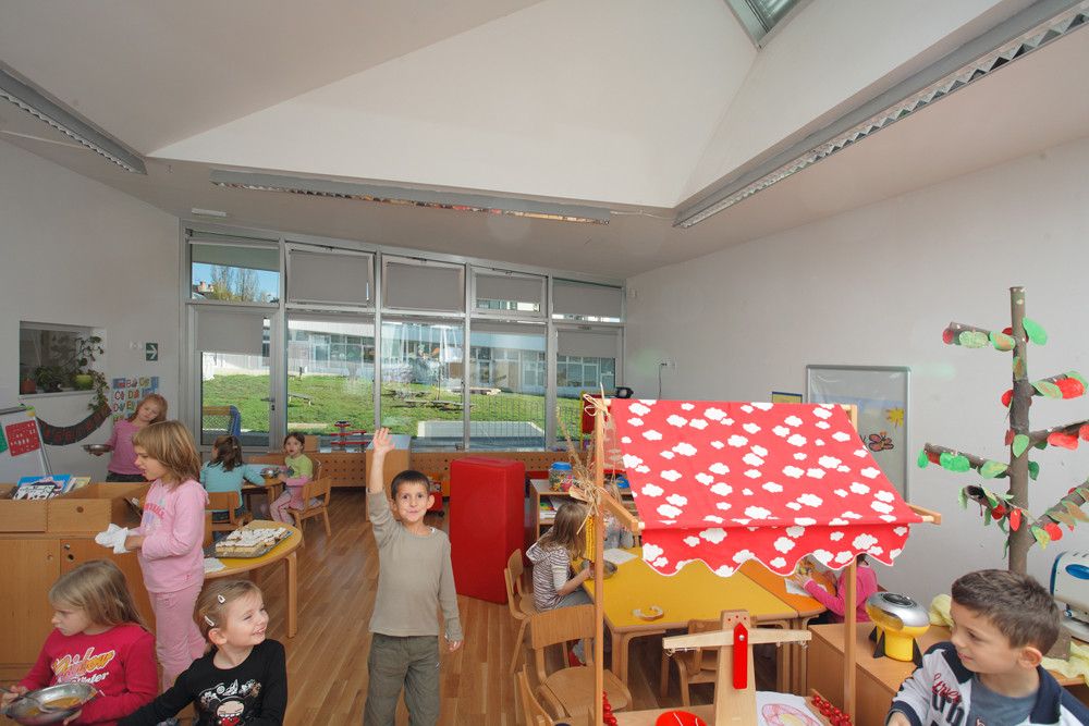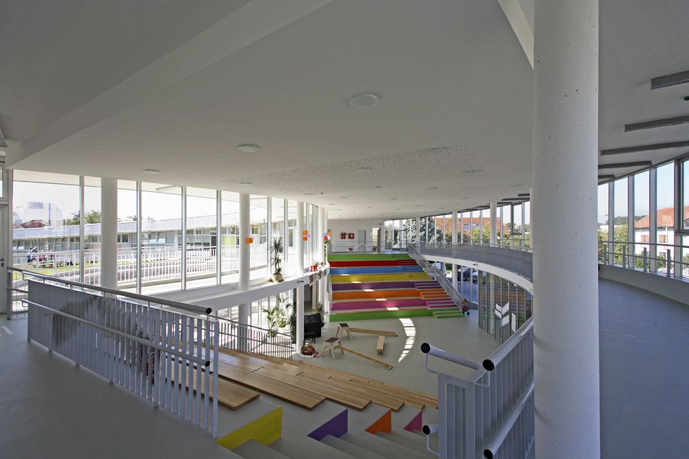 As this a best for a kindergarten, its main facilities are placed on the “ground floor”, which here literally means a story that is on the ground all the way, although its height level changes permanently. The curved belt thus follows the inclination of the filled slope, so that all eight kindergarten and six nursery units have a corresponding outer space at the level of the encircled terrain, roofed over by deep, continuous eaves. The pedagogic idea of “classes in the open” here sees its possible realization. Instead with “open” terraces in “open” space, which often includes both a surrounding fence and a view of nearby parking lots, the kindergarten and nursery units are facing their own roofed-over outer space, and over it to the encircled, but not fenced-in common outer space. It is important to stress that what we have here is “the first public area” many children are faced with and which unifies natural an urban properties. At the highest point of the “ground floor” is the multi-purpose area. The spatial rest, the difference in volumes of the “artificial” and the “natural” element, has been assigned to the management and the service facilities of the kindergarten.