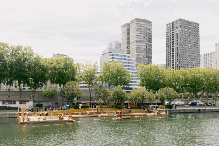 Seine Open-Air Swimming Site, The Grenelle Seine swimming site offered a unique opportunity to take part in a historic project for Parisians, while reaffirming the role of architects, even in highly technical undertakings. After a hundred-year ban on swimming in the Seine, Mater Studio designed and led the construction of a structure that had yet to exist: a seasonal and fully demountable site, designed to accommodate 300 people, including a 950 m², 60-metre-long swimming area, a 415 m² floating structure, and 480 m² of facilities on land. The entire site was installed on the footprint of a former car park and was designed not to disturb the neighbouring residential barges, with which it shares the entire water infrastructure. But above all, the challenge was to invite the public to take a gesture that is as simple as it is intimidating: to dive into the Seine. To achieve this, the project had to act simultaneously on three key levels: the site, the body, and the imagination.