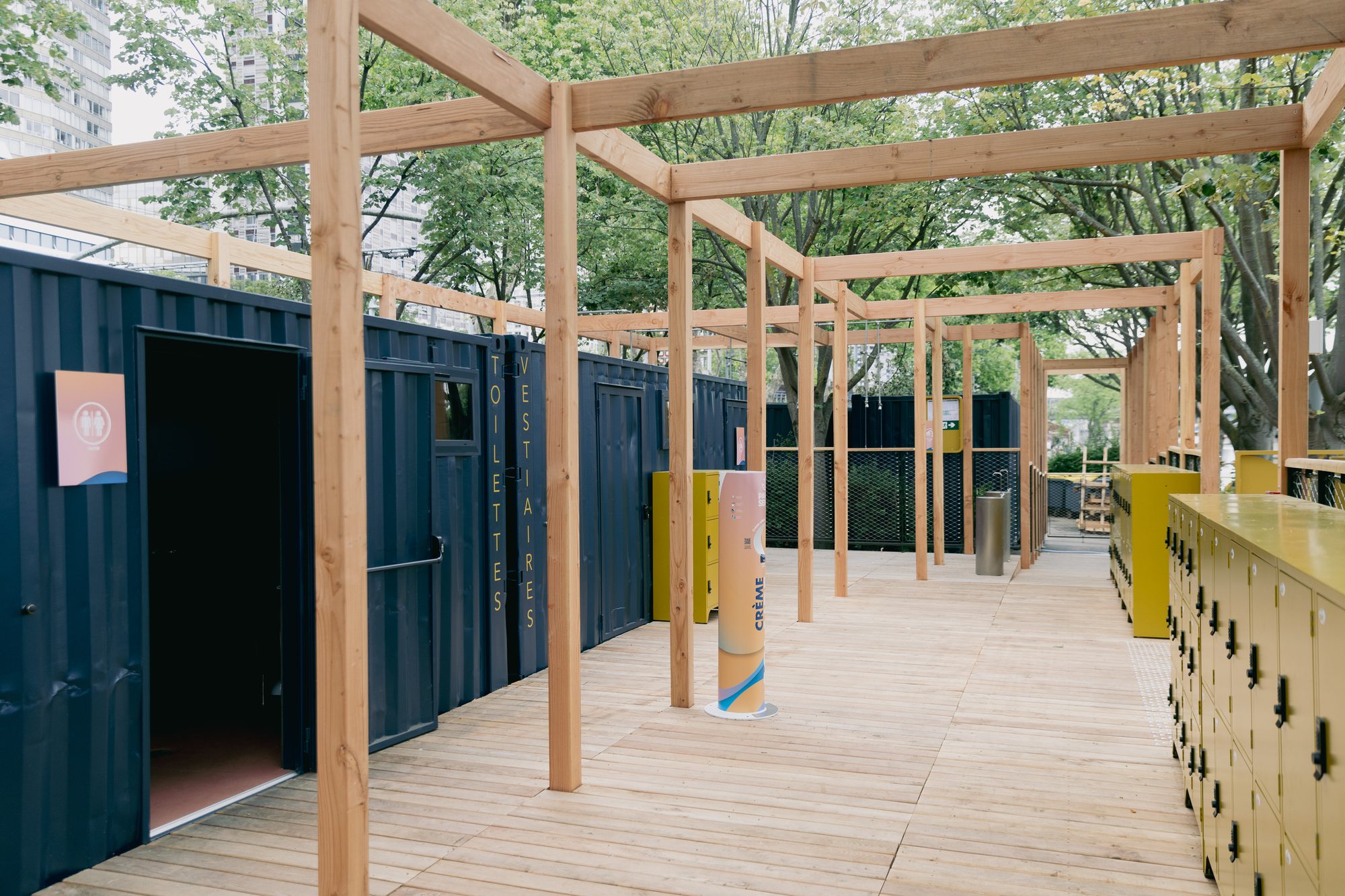 Second, integrating from the outset the features needed to physically reassure the body. This included a gentle, progressive entry into the water; areas for partial immersion; a shallow pool for children; and semi-transparent canopies for sun protection, all helped ease swimmers into the experience. At the end of the swim route, open-air showers, light and breezy, extended the feeling of freshness. Third, sparking the imagination with an island. Dive in, swim across, reach the island—what could be more instinctive and magnetic? Building this floating platform came with serious technical and regulatory challenges. Yet the sight of swimmers climbing onto it with smiles on their faces confirms that this seemingly modest structure is, in fact, a central element of the project.