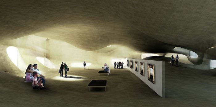 The structure of the museum has a kind of stereotomic nature as if the a mass had gradually been cut into specific forms to create a new spacial typologies that re-imagines and re-defines the comprehensive form. The need to form a unique framework affected the overall outcome of the building envelope and interior spaces, transforming the typical rectilinear style to one that’s curvilinear and organic. The structure is integrated throughout the building and influences the interior spaces.