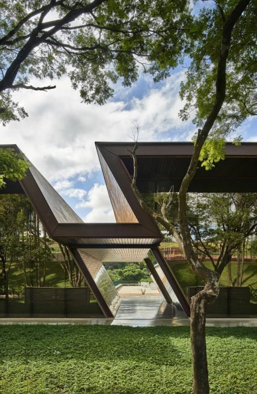 Metallic Structure was the chosen structure for the Club Pavilion because it can make big spaces with thin structural pieces, allowing, without major interferences, the use of big glass panels on the facades of the spaces. The ceiling is made of a thin layer of thermal acoustic metal tiles, with wood tiles on the inside, with the same wood tiles on the outside but with more space between them.