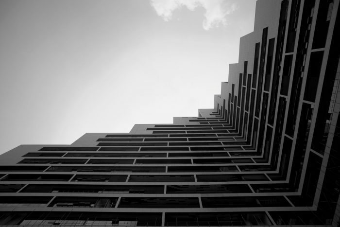 First, the division enables to consider each office unit in singularity providing option to step the glazing back thus creating additional balcony-yet another unusual feature in a typical office layout. This “in between space” also acts as a shading device minimizing the cooling load. And finally it provides room for the individual air conditioning units without interrupting the main facade. This duality is further expressed in the choice of materials. The outer layer composed of light stone is in focus catching and reflecting the rays of the sun. The inner balcony facade is lined with dark grey aluminum panels and remains in shadow hiding the ‘contents’ within.