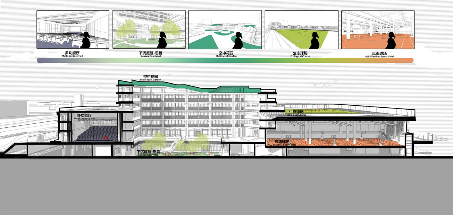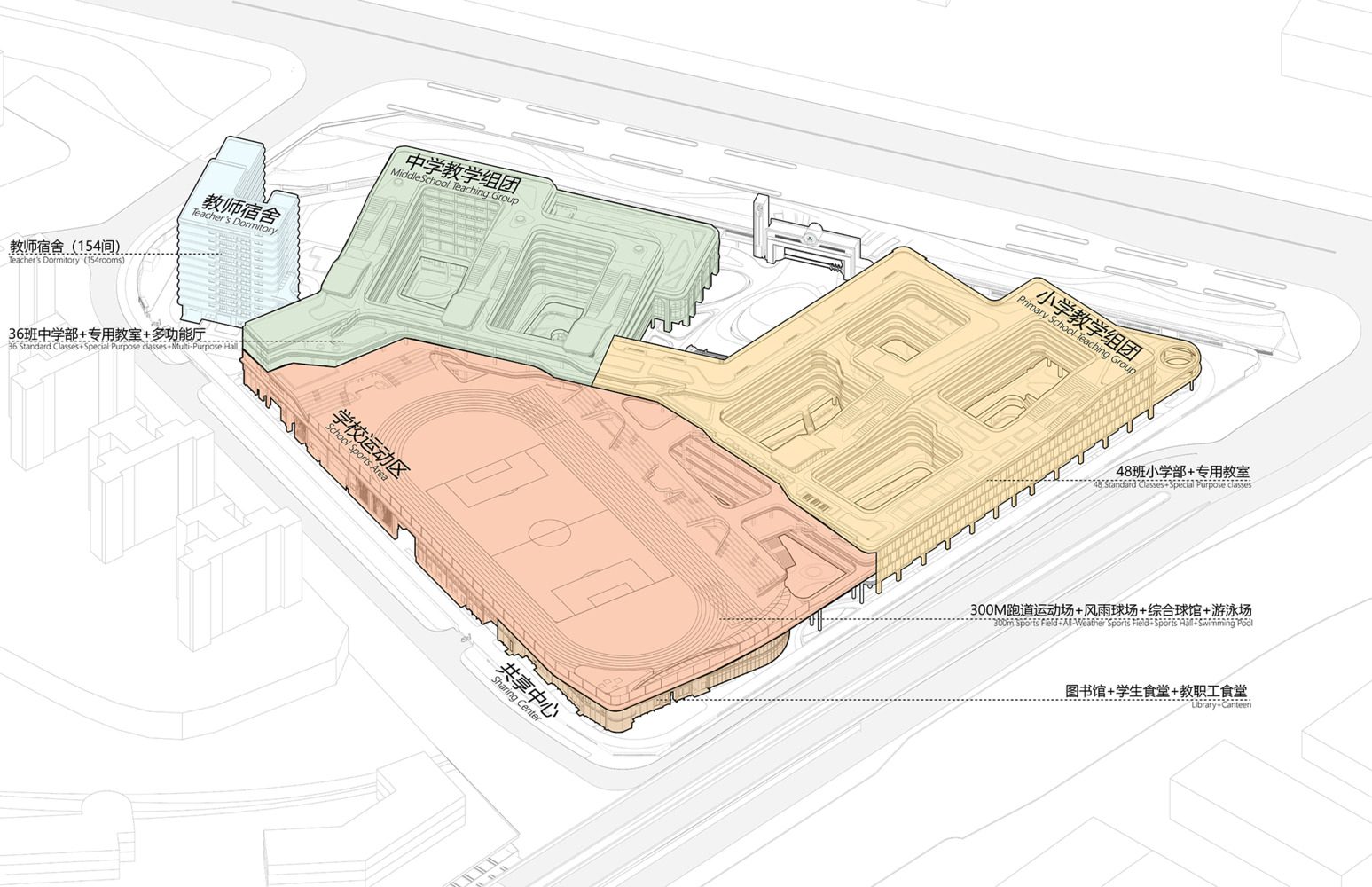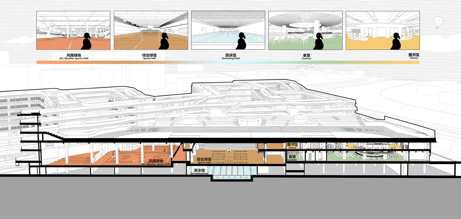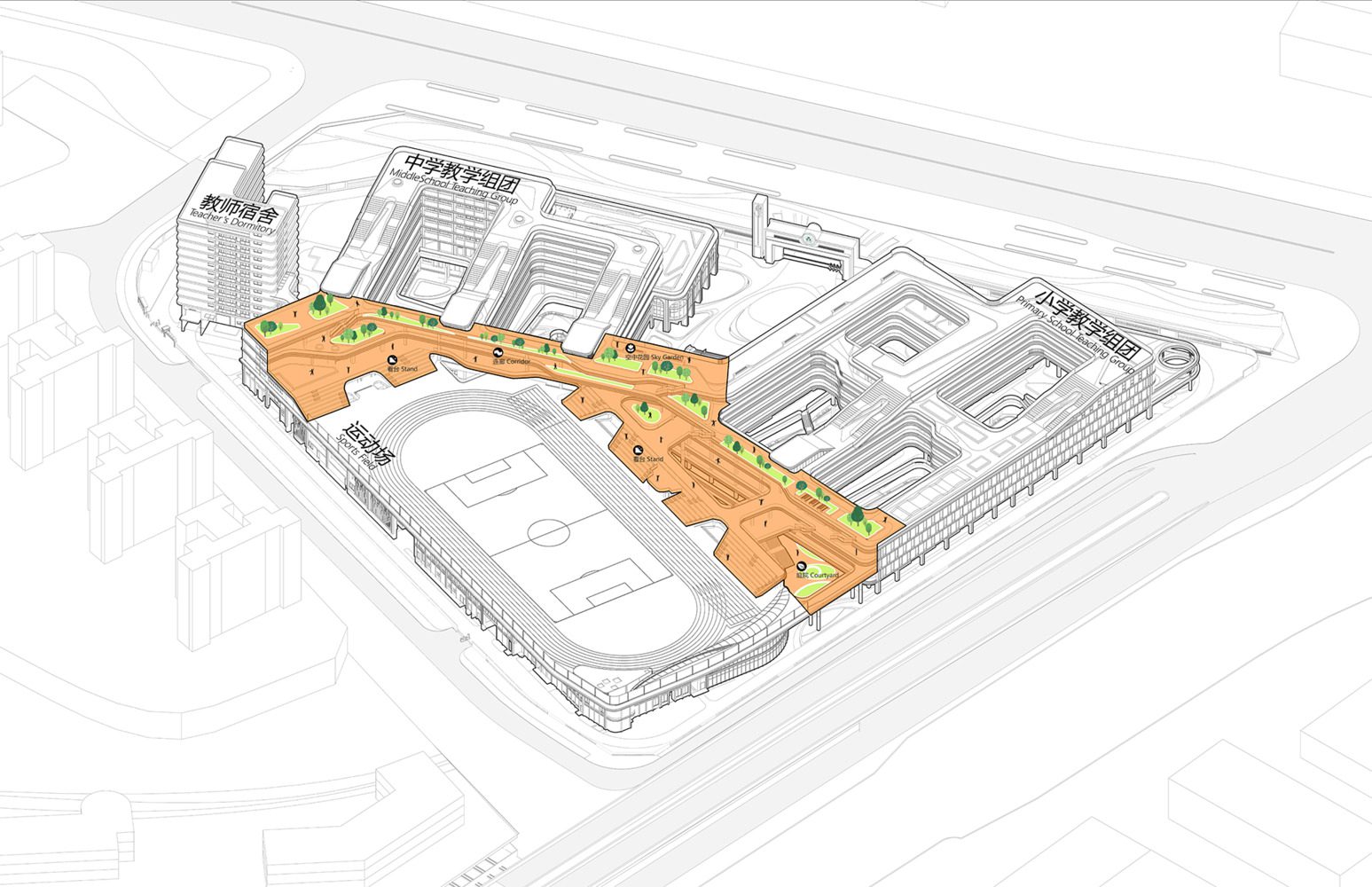 The Shenzhen Middle School Guangming Science City Campus represents an exploration of what “future campus architecture” could be. Through this project, we aim to respond proactively to future urban development through architectural design. At the same time, we focus on three spatial dimensions in the creation of the campus: multi-form, multi-level, and multi-scale. From these three dimensions, we attempt to construct a rich and layered spatial system for the school, catering to the diverse environmental needs of various teaching models. The entire design proposal goes beyond simply creating a standardized, vibrant campus—it aspires to build a school of the future, offering a richly immersive educational experience full of vitality.