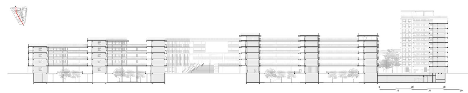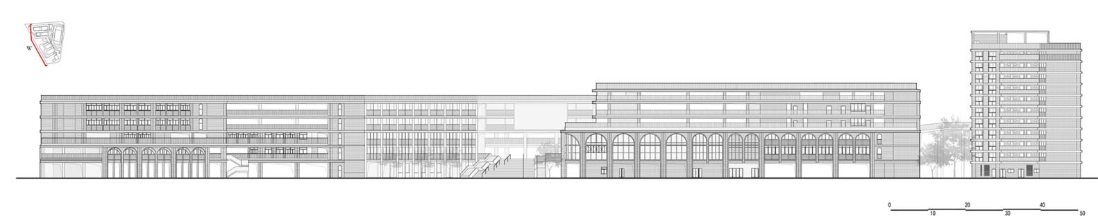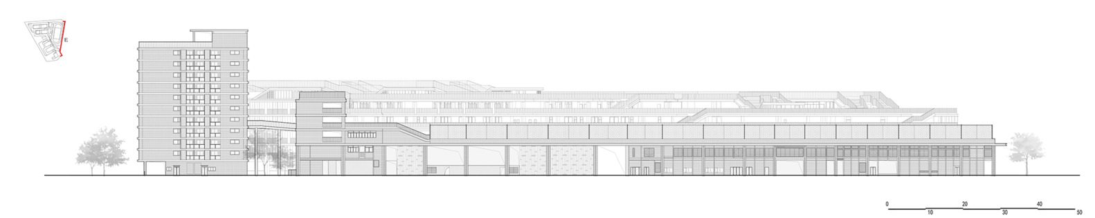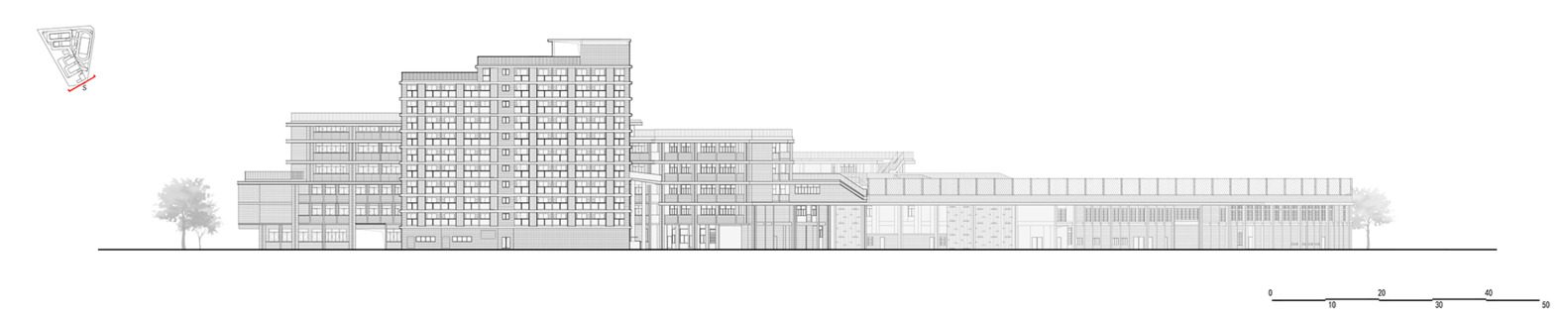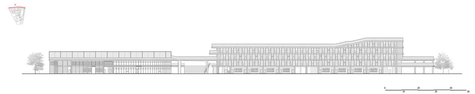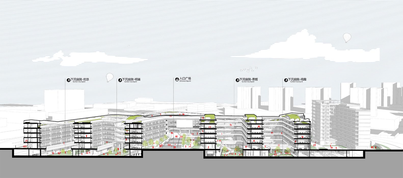 The site is surrounded primarily by industrial technology parks and residential areas. Of particular relevance is the Changzhen Depot to the east of the project and the metro station-topped public housing community above it. Grounded in the most fundamental design thinking, we also prioritized addressing the real, site-specific challenges in the surrounding environment. Taking these two factors into account, we proposed five design strategies tailored to local conditions: