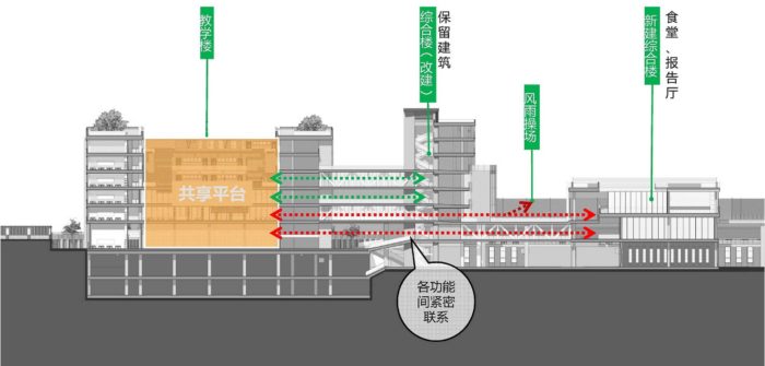 The teaching functions of the project were thoughtfully arranged on the site’s south side. The project effectively addressed the limited space challenge by vertically superimposing teaching and auxiliary functions. The teaching and comprehensive buildings now seamlessly interact through overhead floors and platforms, enhancing connectivity within the campus.