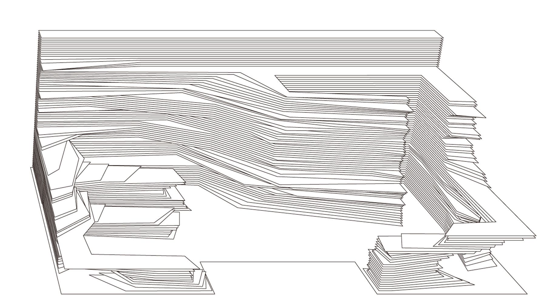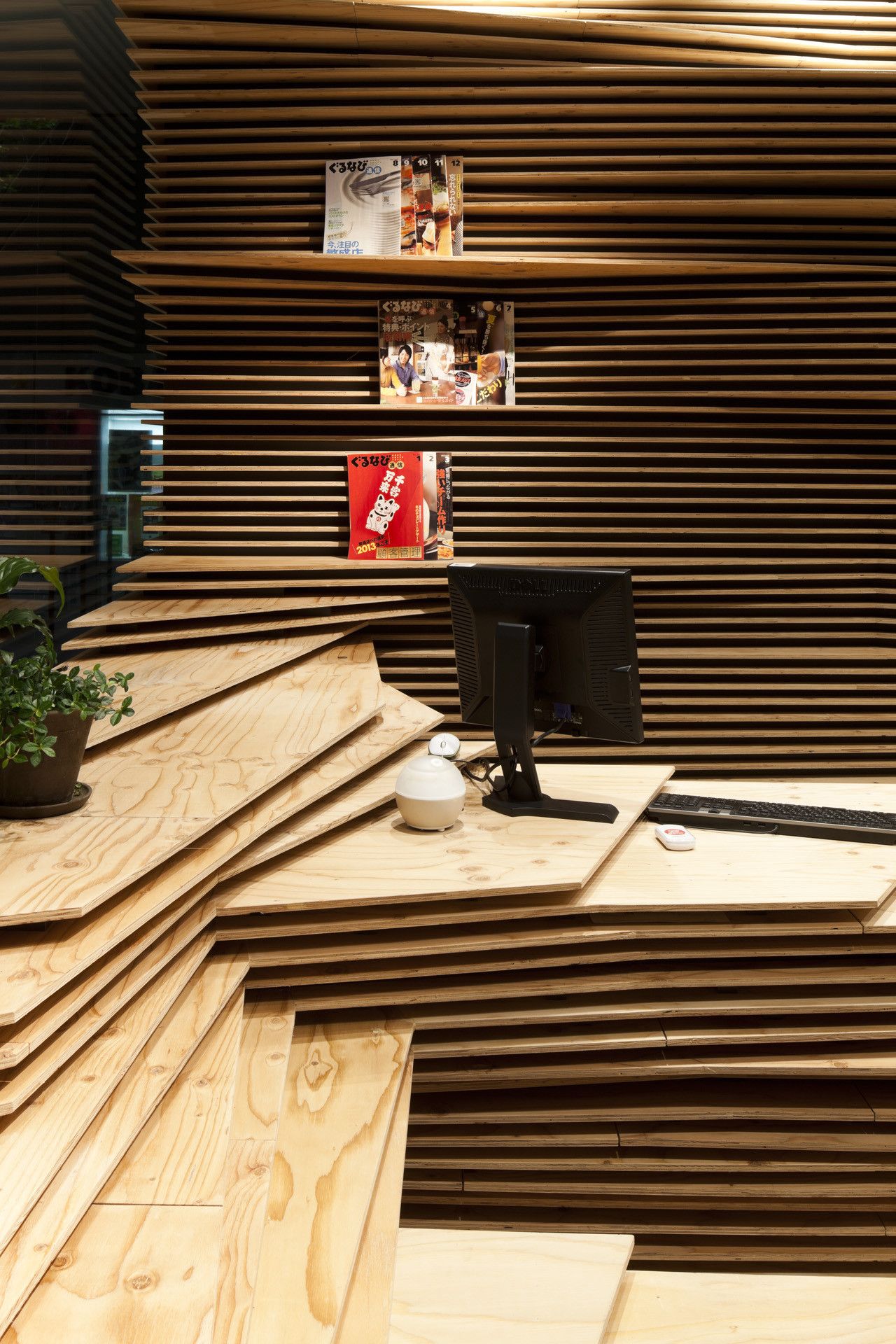 Everything in the room is crafted from layered panels of wood. Among the interior furnishings is a reception desk, seating, and storage facilities. The sliced planes of the wood create strong horizontal lines that break up the installation to form an internal topography.