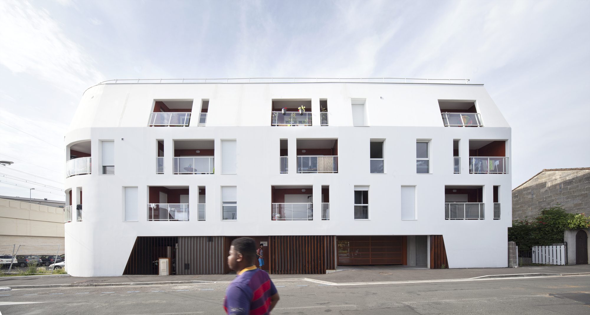 The top floor is curved to soften the silhouette of the building. This work on the shape allows the building to fit in the surrounding environment without being too imposing. The facades are put in rhythm with a graphic pattern of vertical opening and loggias. Every housing as an exterior space. An extra volume on the roof allows the creation of duplex apartments.