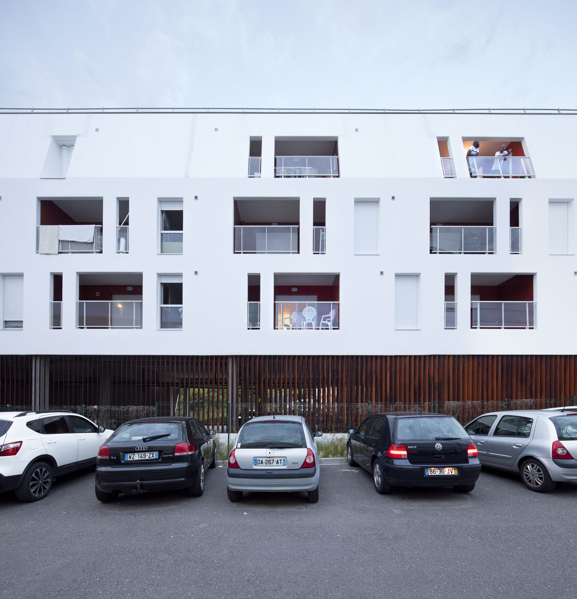 On the main floor, the parking walls are made with Corten steel louvers which allows views from the street to the inside garden and visually detach the building from the ground. The white paint on the concrete façades echoes others symbolic constructions of the street. The inside walls of the loggias are painted in Corten red. Those two tones are alternatively used for the entire project.
