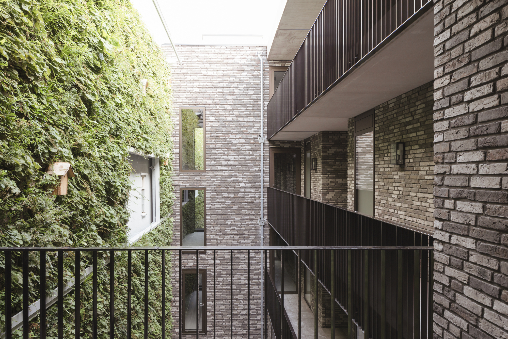 The back of the building is peaceful. The rear facade has been placed at a distance from the block behind to create an outdoor space. The ground-floor flats have back patios, making them ideal for families. The apartments on the upper floors have loggias on a gallery. All the outdoor spaces look out on a green wall, which affords good acoustics and a pleasant climate. Simonzs’ design shows careful attention to detail.