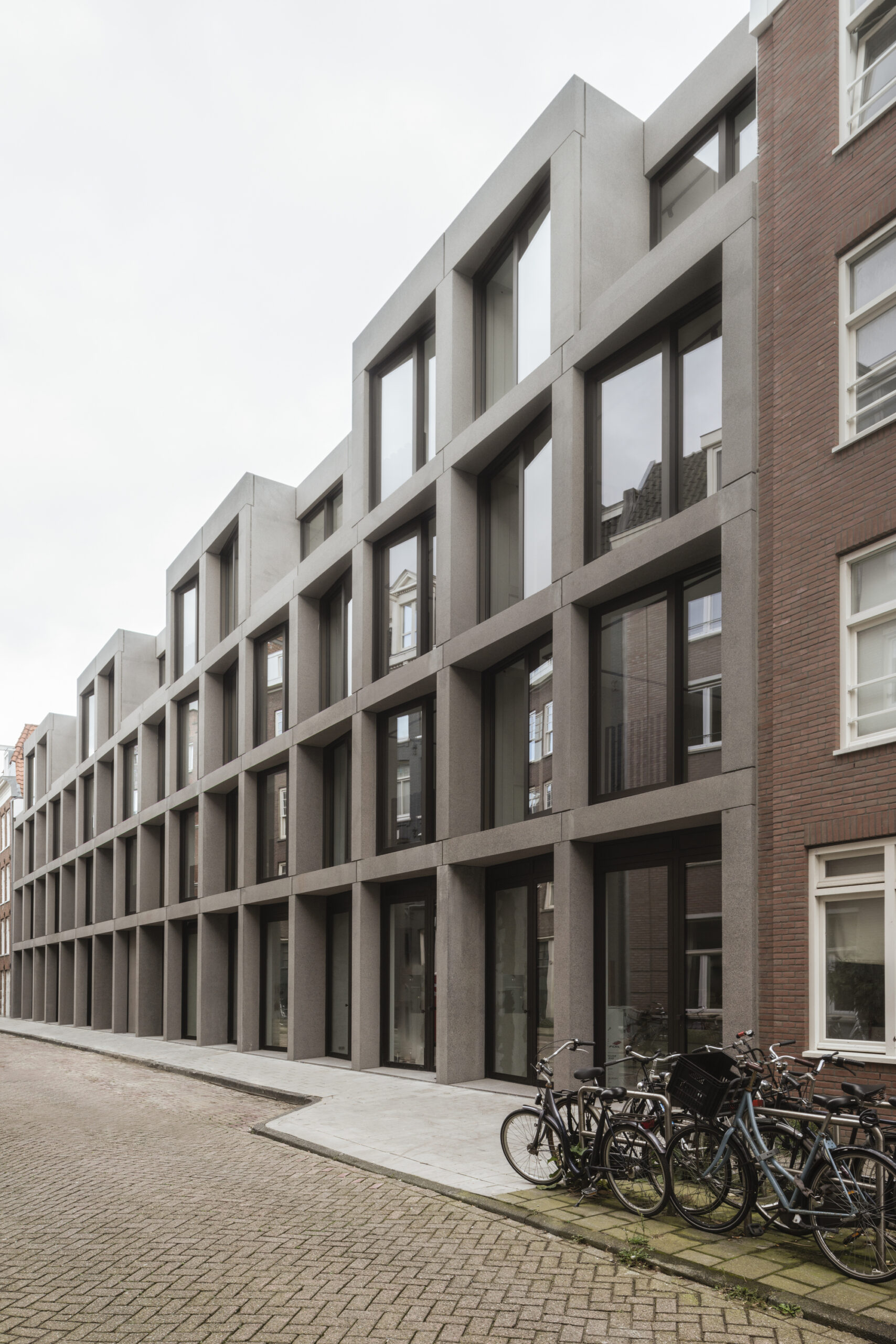 Closer inspection reveals another change in scale: the concrete slabs are narrow and deep near ground level and become wider and shallower as they ascend. As a result, the ground-floor residences are slightly set back from the street. The windows on the top storeys are almost flush with the facade, while those at street level are recessed. The facade therefore appears to lean forward slightly, making playful reference to Amsterdam’s many slanting historical houses.