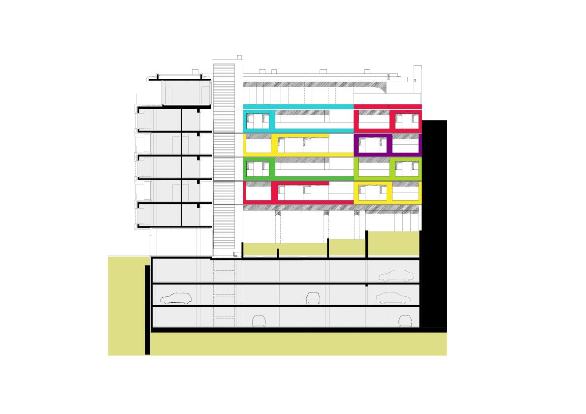 The large openings of the facade are shaded by adjustable aluminium louvers; beside of the sun protection, the additional role is that they allows the light in, therefore, they serve as an excellent personalised visual filter. Certainly the colour of the lamellas is the same to the colour of the given flat – if all louvers are down, the building becomes a real box built by coloured Lego cubes.