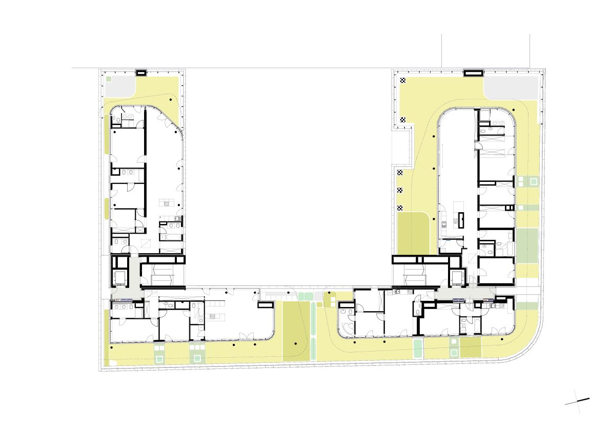 The flats can be reached through two vertical transportation cores, which are placed in the two breakpoints of the U-shaped building. Open side corridors heads from the staircases and elevators to the flats, similar to the Budapest tradition, in this way they could be naturally ventilated and lighted from two sides.