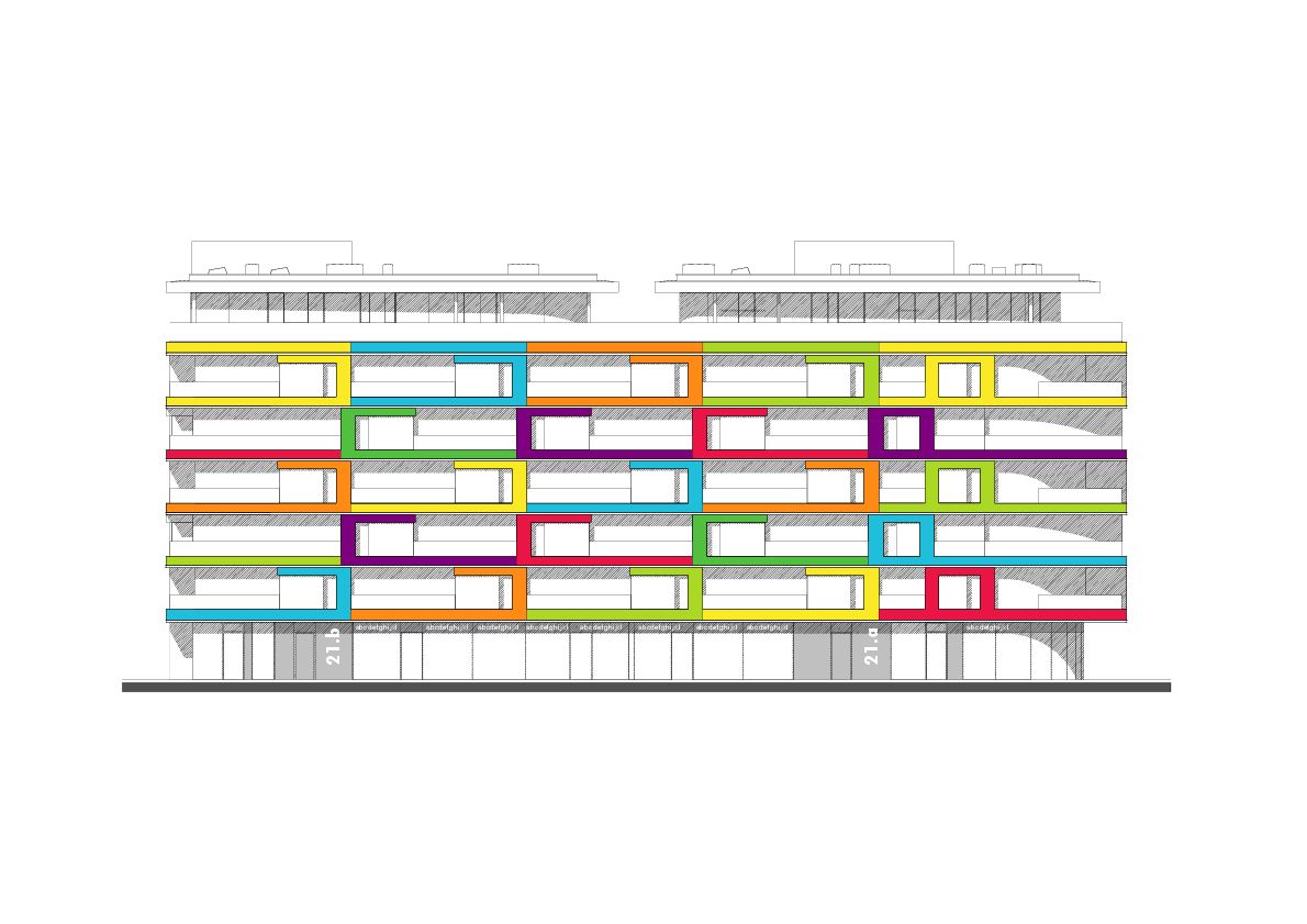 The most important material of the external facade is the coloured glass. Yellow, orange, red, green, dark green, blue turquoise and dark blue: unmixed and bright colours. Each colour of the facade belongs to a certain flat; this colour then appears on the entrance door – therefore the mark of the flat becomes visual- and makes trivial the identification.