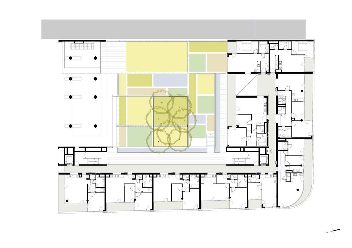The open corridors face the miscellaneous and quiet internal garden and the overgrown green-wall. The southern wing of the building is placed on two-storey high ‘V’ shaped legs. Through this semi-covered public area the building and the city contacts each other, the internal garden and facades are visible for the external observers, too.