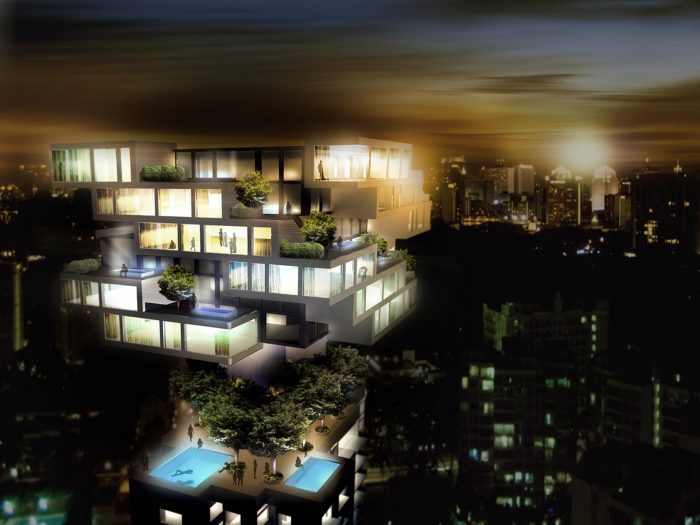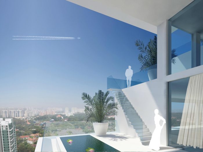 What type of penthouses would be most desirable in Singapore? A villa in the sky with a private sky terrace would combine the exclusive intimacy of a villa with the grand views of a penthouse. The new sky village is organized around a central core area with 3 spiraling stairlike cantilevering rooms with terraces above. Each penthouse has access to a large terrace. To achieve maximum privacy most penthouses are duplexes. The new structure is positioned on top of the existing tower via a structural transfer layer in which several elements of the collective sky deck are integrated (the pools, the tree pots, etc).