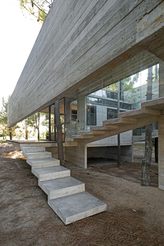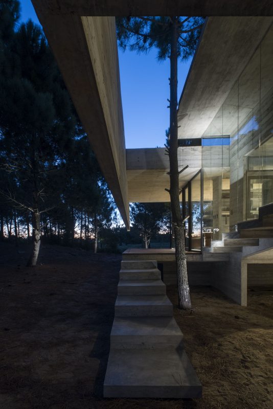 S+J House is located in the seaside neighborhood Costa Esmeralda, a private development 13 km north of the city of Pinamar and four hours away from Buenos Aires city. Despite being almost plain, the plot of land slopes softly towards its back. As the Studio proposed to preserve the lot’s dense pine grove, only the trees on the construction site were removed in order to build the house.