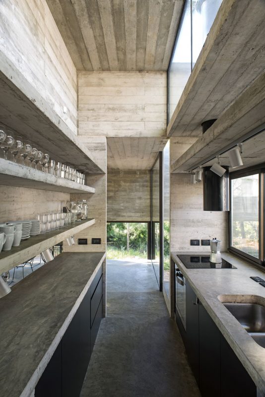 The client, a group of two families, requested a house that could lodge both at the same time and that could be rented out. The commission consisted of a recreation house built entirely out of exposed concrete, with minimalist interior spaces and little maintenance requirements. The brief included two en-suite bedrooms with their own closets and two cabin-like minimum rooms sharing a bathroom. So as to make the social area the most important place in the house, an external expansion was requested. Also, the client asked for a closed space for beach vehicles and a semi covered area parking lot. Special emphasis was laid on the need to establish a fluid relationship between the inner spaces and the exterior, which would allow a closer experience of the forest.