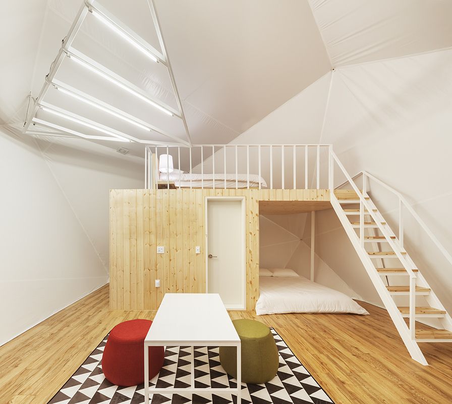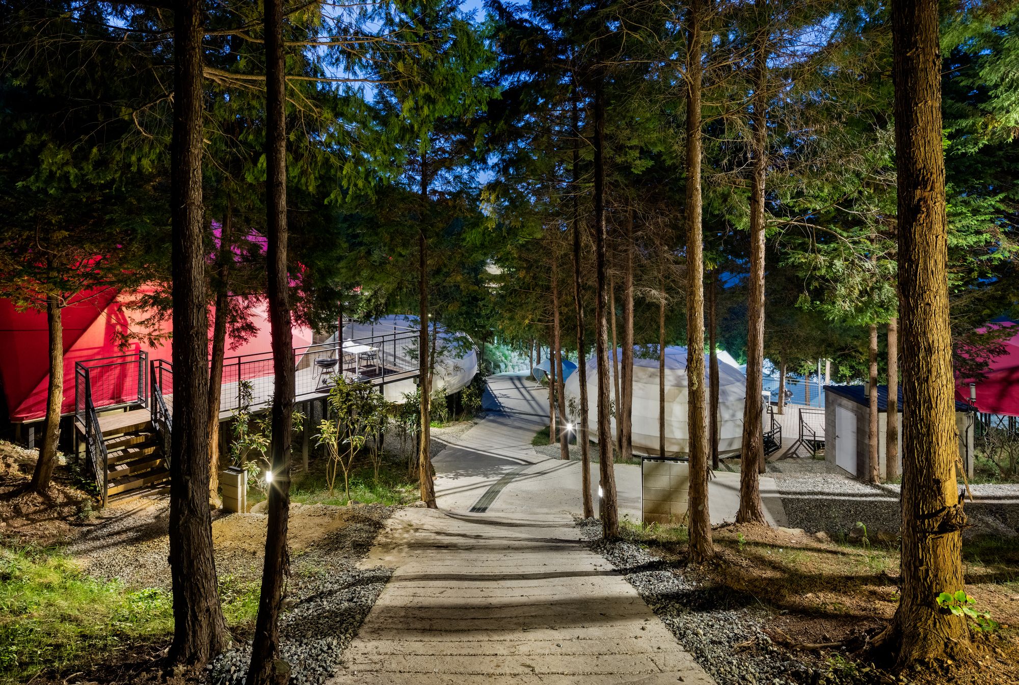 The Suncheon resort is managed by SJCCglamping, a subsidiary of the Korean company POSCO, one of the largest steel manufacturers in the world.  In partnership with the contractor, Mind Glampers, the tents were developed over a three-year period. Using this pre-developed tent model, it took two years to complete the SJCC project with POSCO. Atelier Chang developed a new, patented technology to achieve both the comfort and lightness which space and design concept demanded. This technology uses double layers of fabric with insulation between layers to keep the glamping units sustainable and viable in a climate where annual temperatures can range from as low as minus 20 degrees to as high as 40 degrees Celsius. The units – when properly maintained – are expected to have a lifespan of at least 10-15 years.