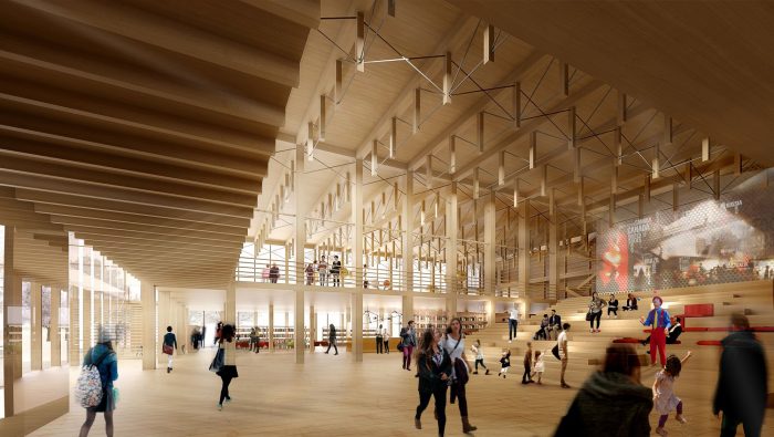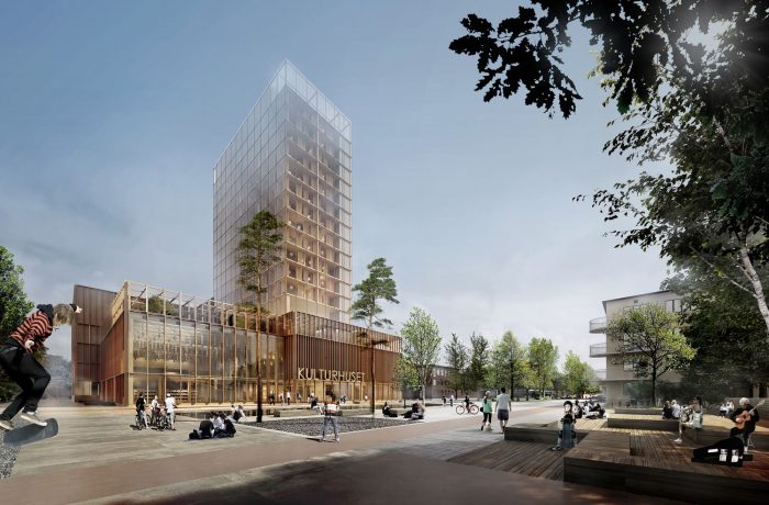 Construction of the cultural center is composed of a stack of prefabricated timber modules reinforced by concrete slabs. A hybrid of glue-laminated timber and steel construction will allow for a flexible, open-plan space, able to host all of the different facilities. The venue has other design elements which continue the theme of the flexibility of use, such as retractable walls for rooms to be expanded or divided so as to better serve the function at hand – from an exhibition to a large congress. “A cultural center in Skellefteå just has to be built with wood! We’re paying homage to the region’s rich tradition and we’re hoping to collaborate with the local timber industry. Together we will create a beautiful venue, open for everyone, which will both have a contemporary expression and age with grace”. – Oskar Norelius, Lead Architect at White.