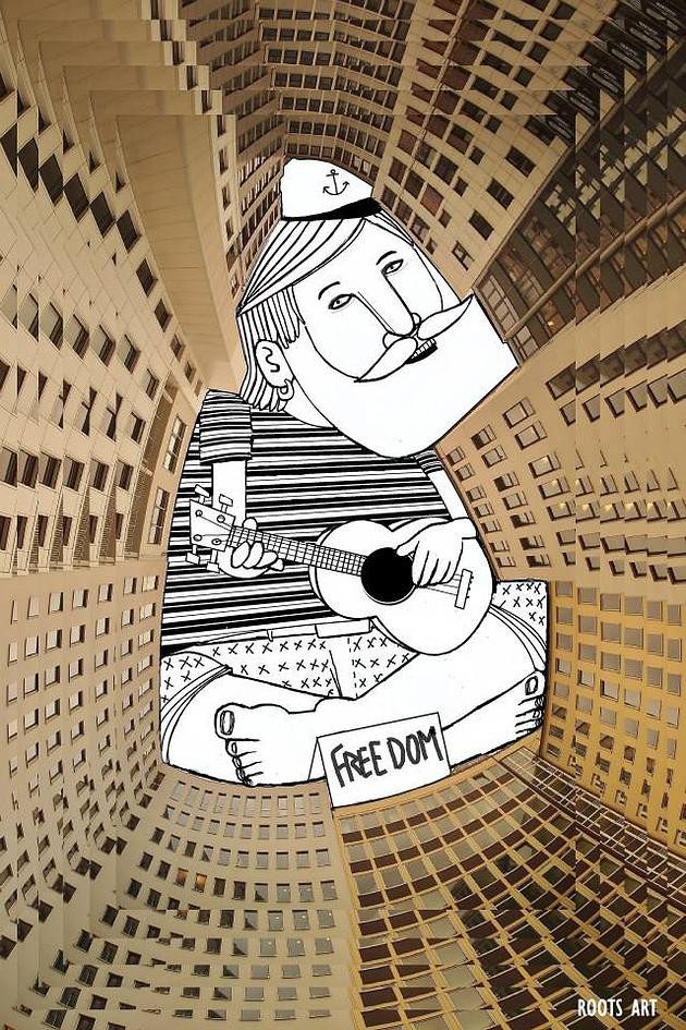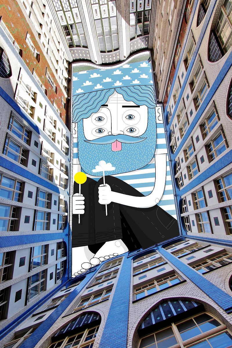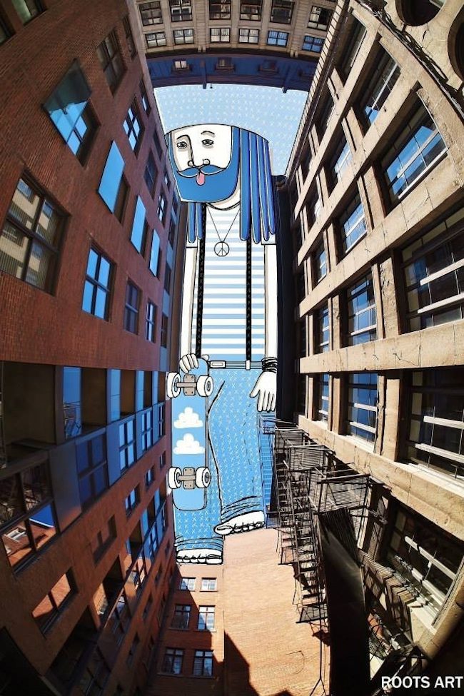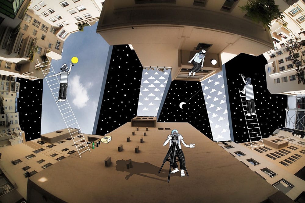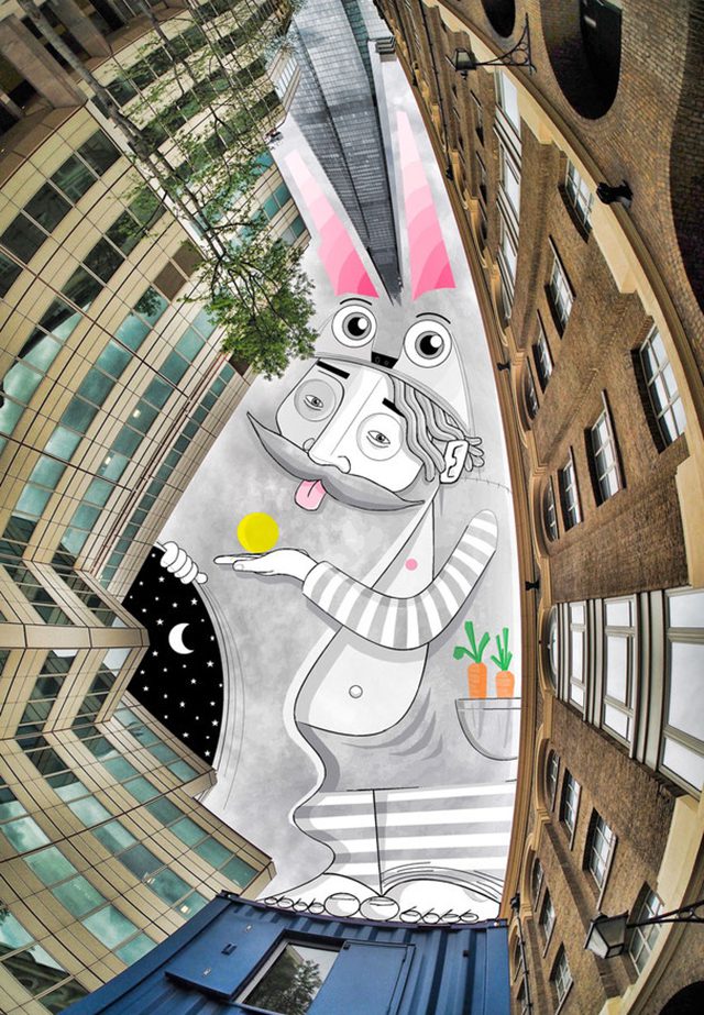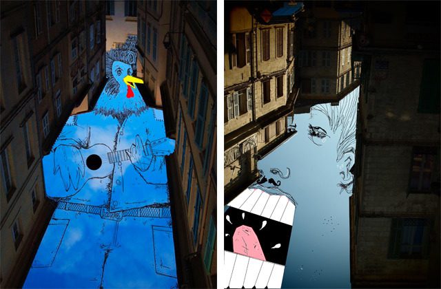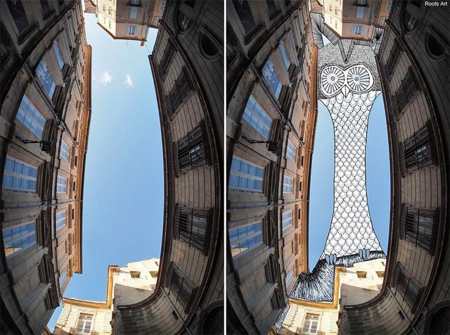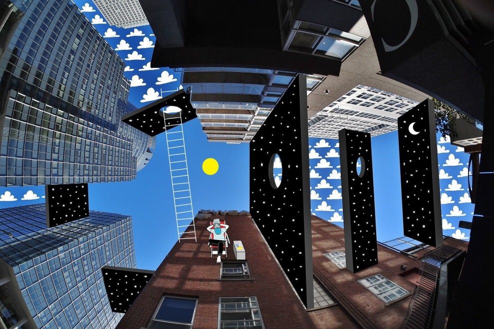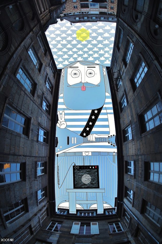 The French artist Thomas Lamadieu has taken these skyscapes for his canvases. On top of photographs shot skyward, he lays down his mind’s marks of what occupies the voids. A guitar-playing chicken, a strung-out owl, a racoon-riding Scotsman- the truth is that the mind is the limit. And so there is no limit. The resulting illustrations become part of the artist’s Sky Art series.