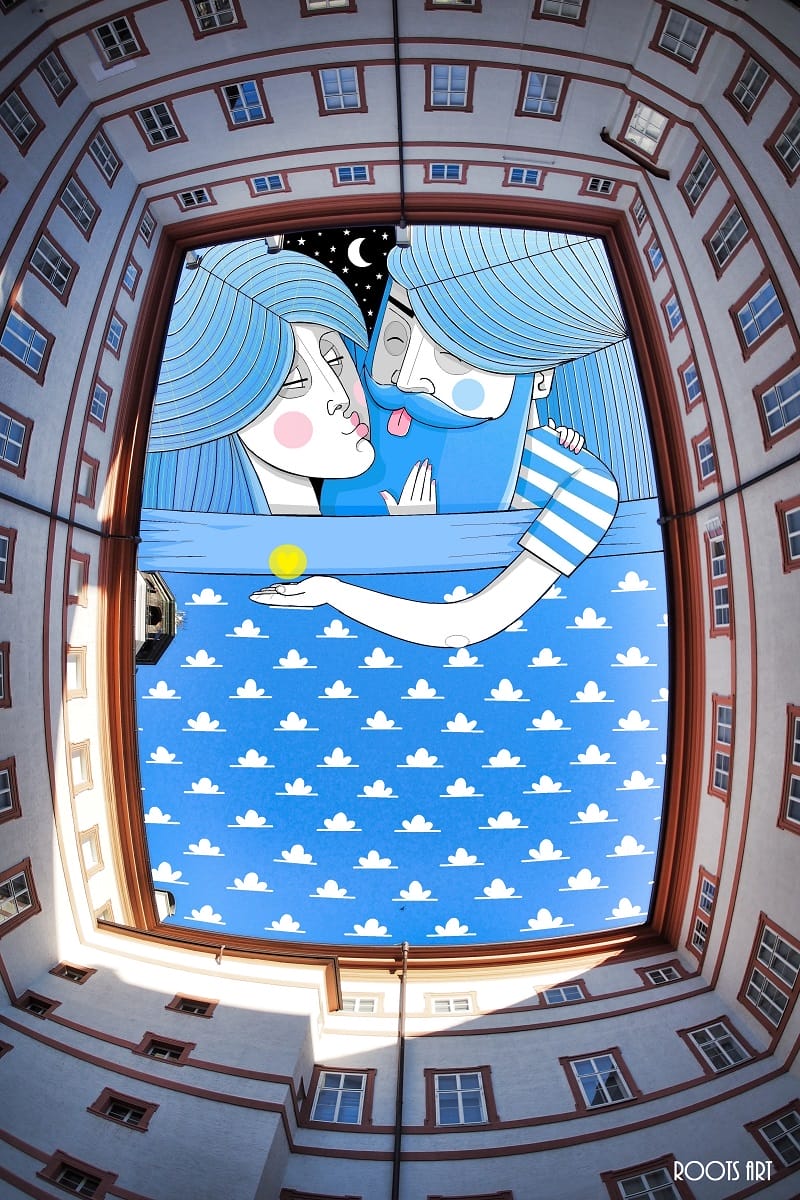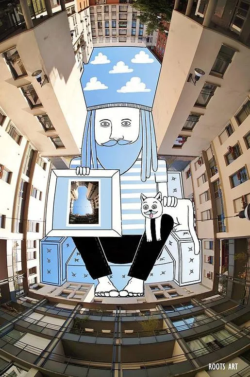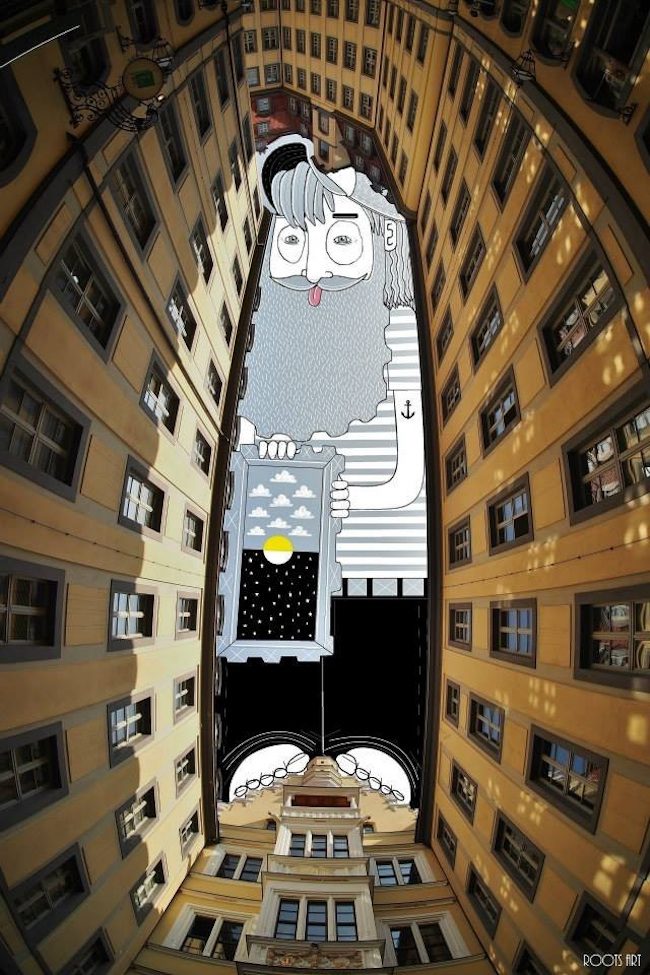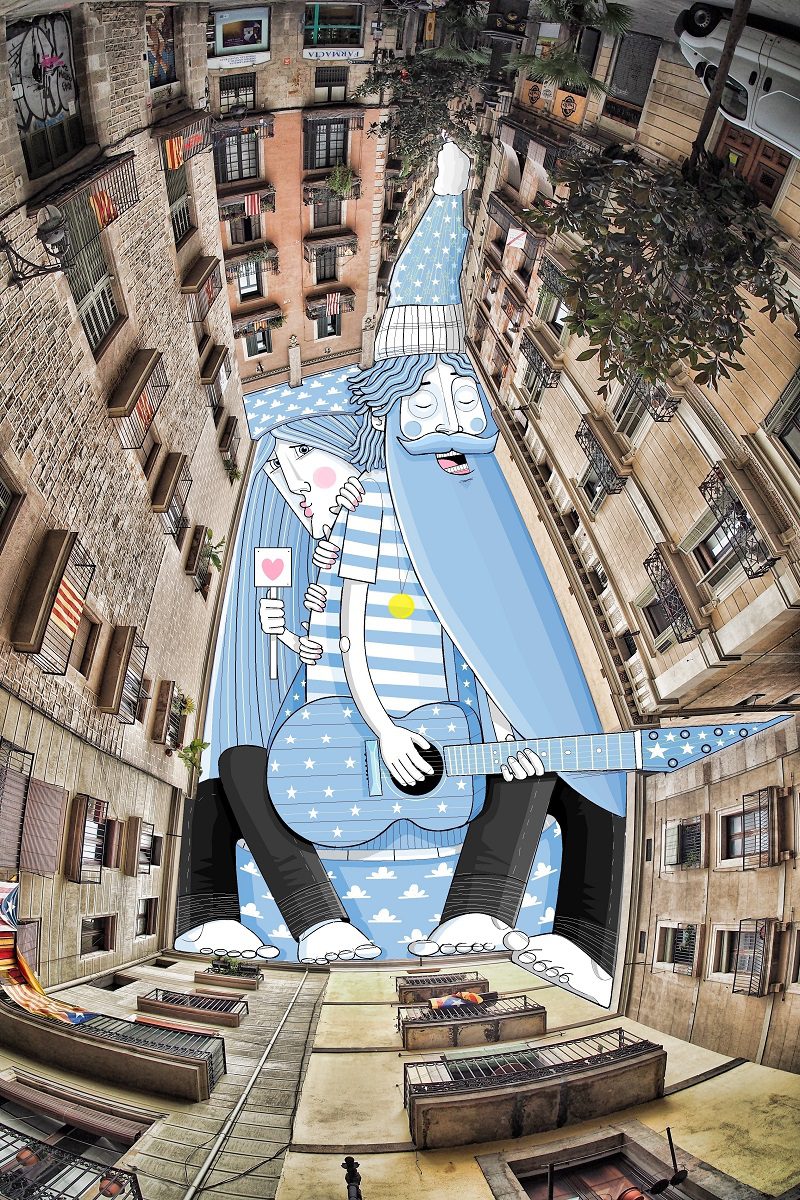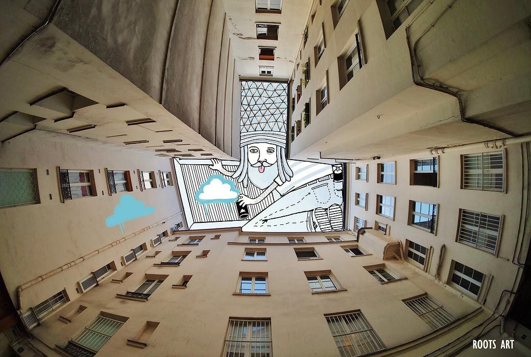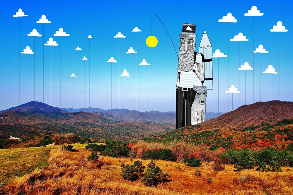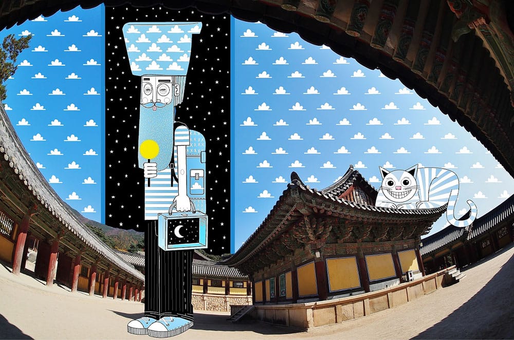 The French artist Thomas Lamadieu has taken these skyscapes for his canvases. On top of photographs shot skyward, he lays down his mind’s marks of what occupies the voids. A guitar-playing chicken, a strung-out owl, a racoon-riding Scotsman- the truth is that the mind is the limit. And so there is no limit. The resulting illustrations become part of the artist’s Sky Art series.
