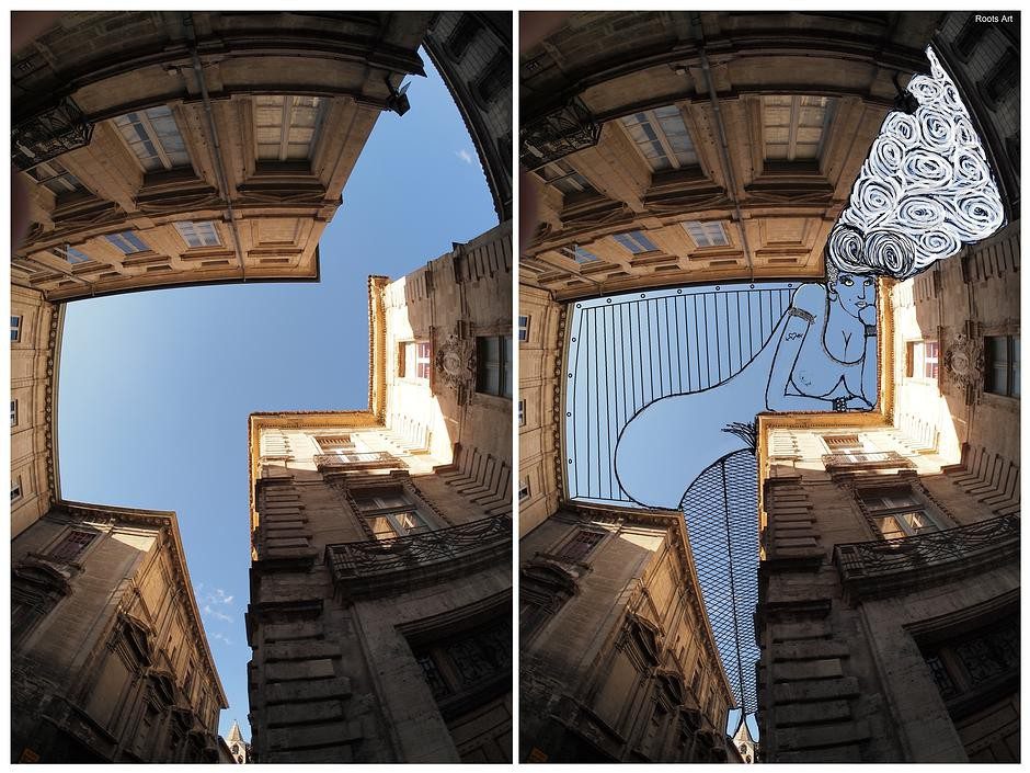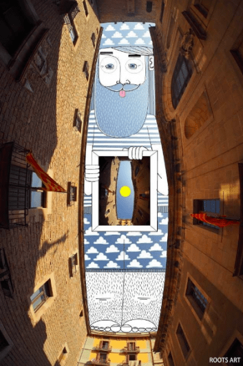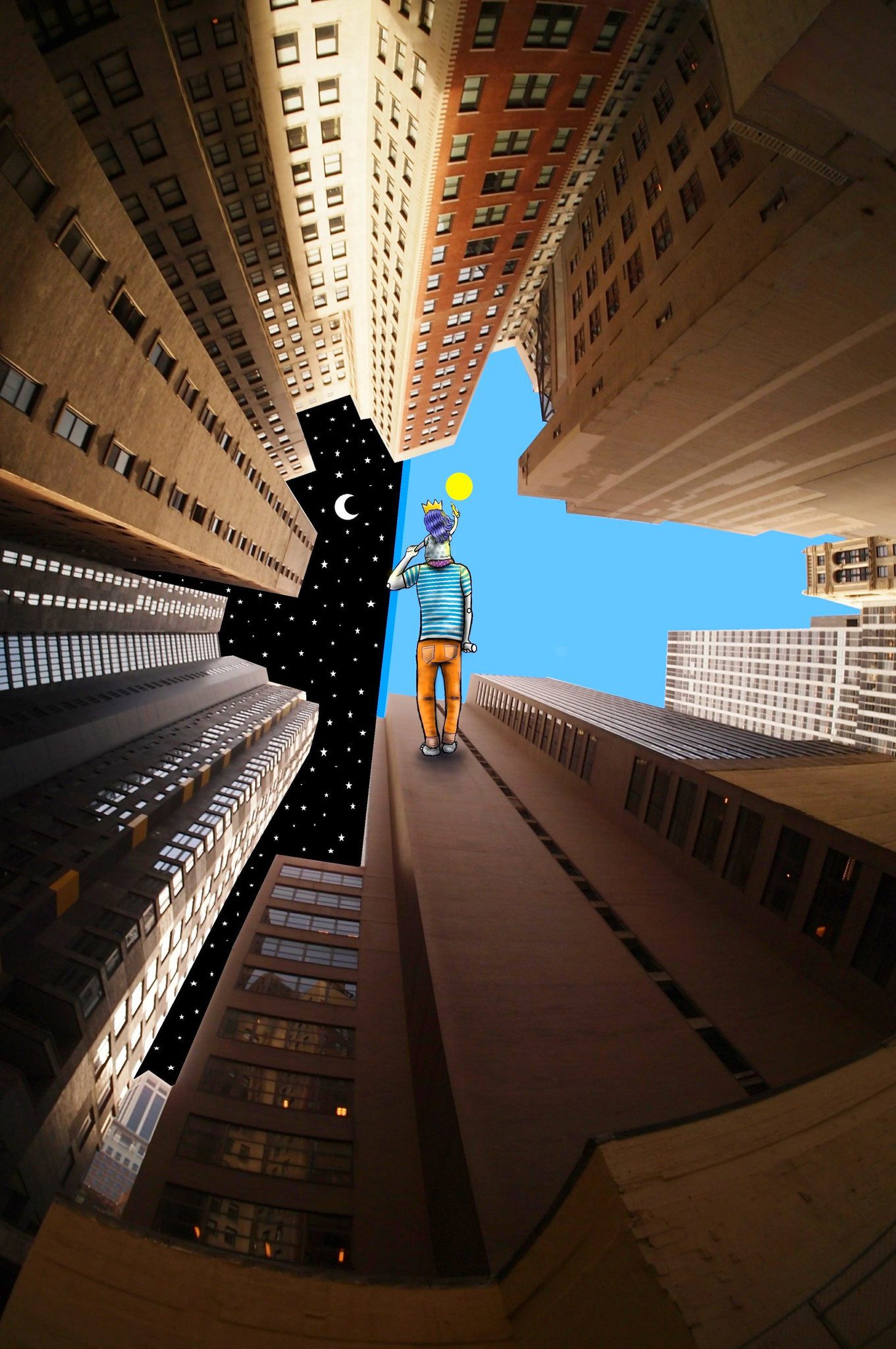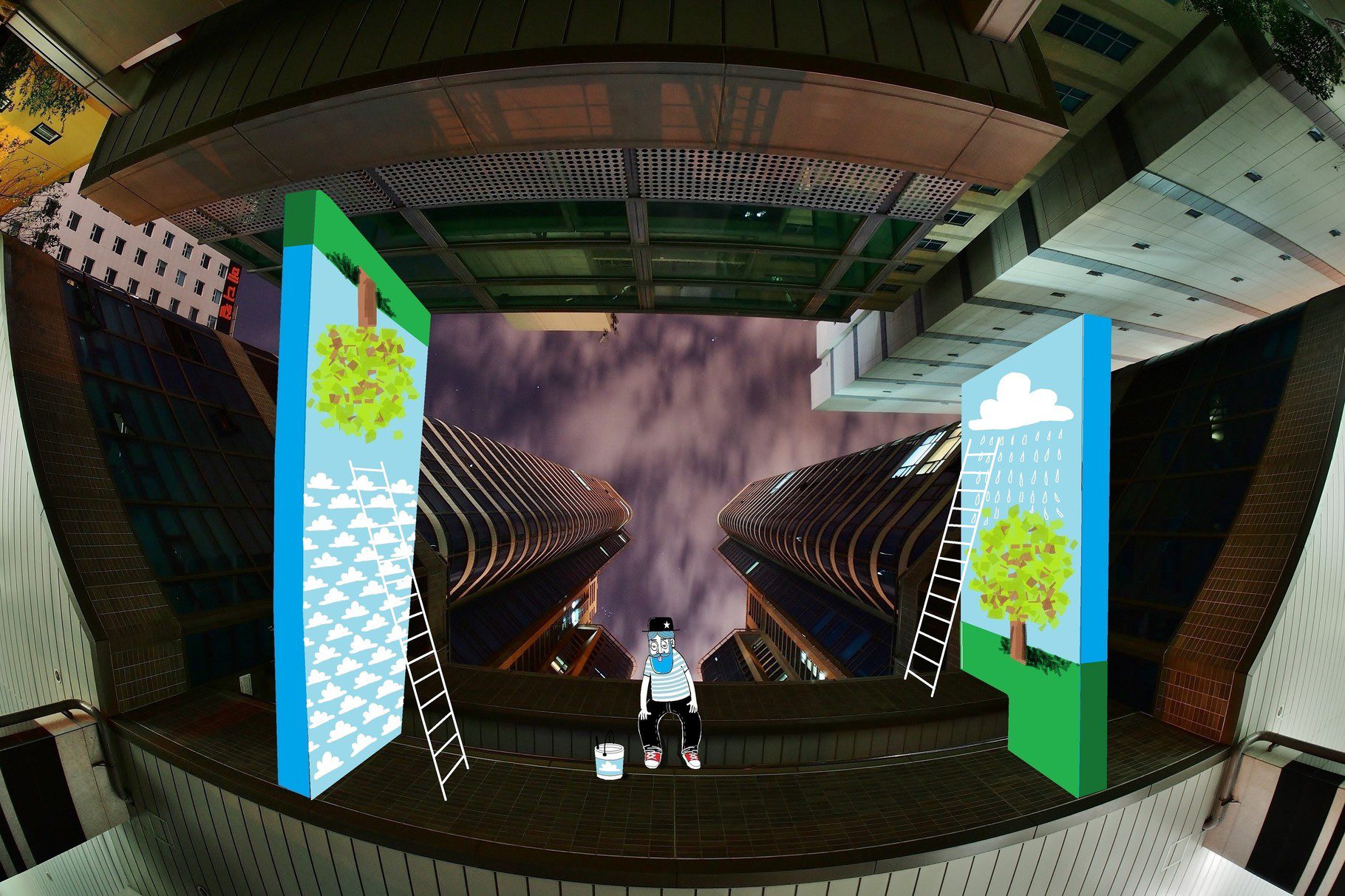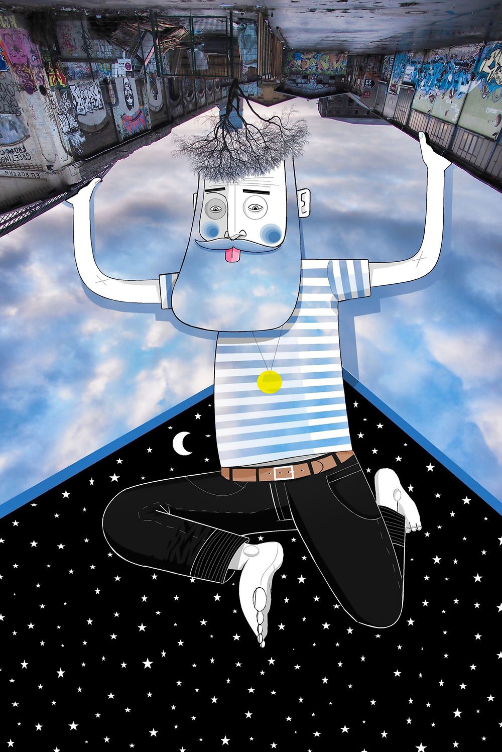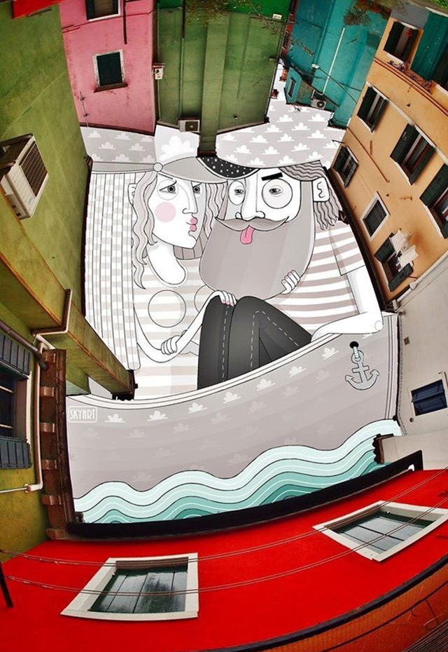 The French artist Thomas Lamadieu has taken these skyscapes for his canvases. On top of photographs shot skyward, he lays down his mind’s marks of what occupies the voids. A guitar-playing chicken, a strung-out owl, a racoon-riding Scotsman- the truth is that the mind is the limit. And so there is no limit. The resulting illustrations become part of the artist’s Sky Art series.
