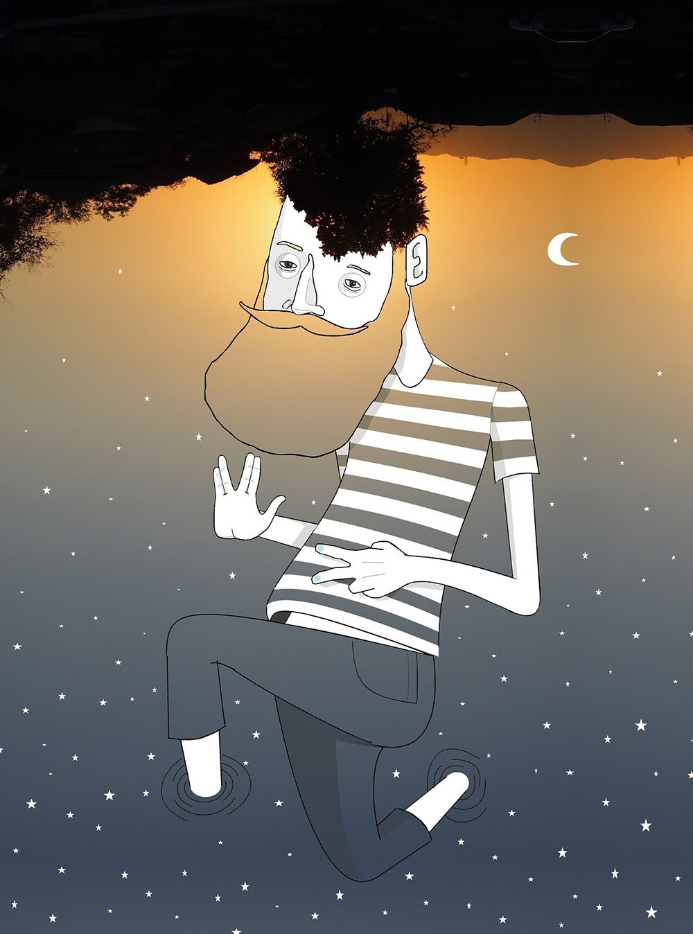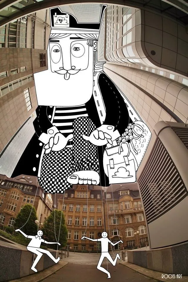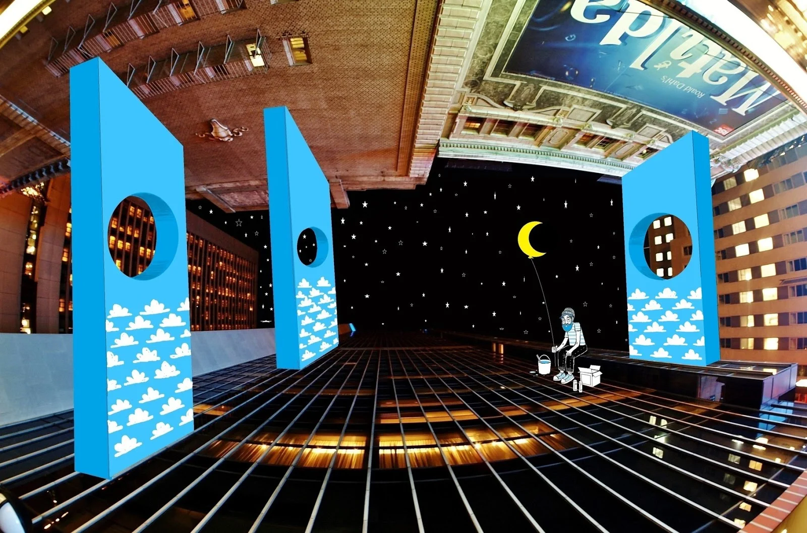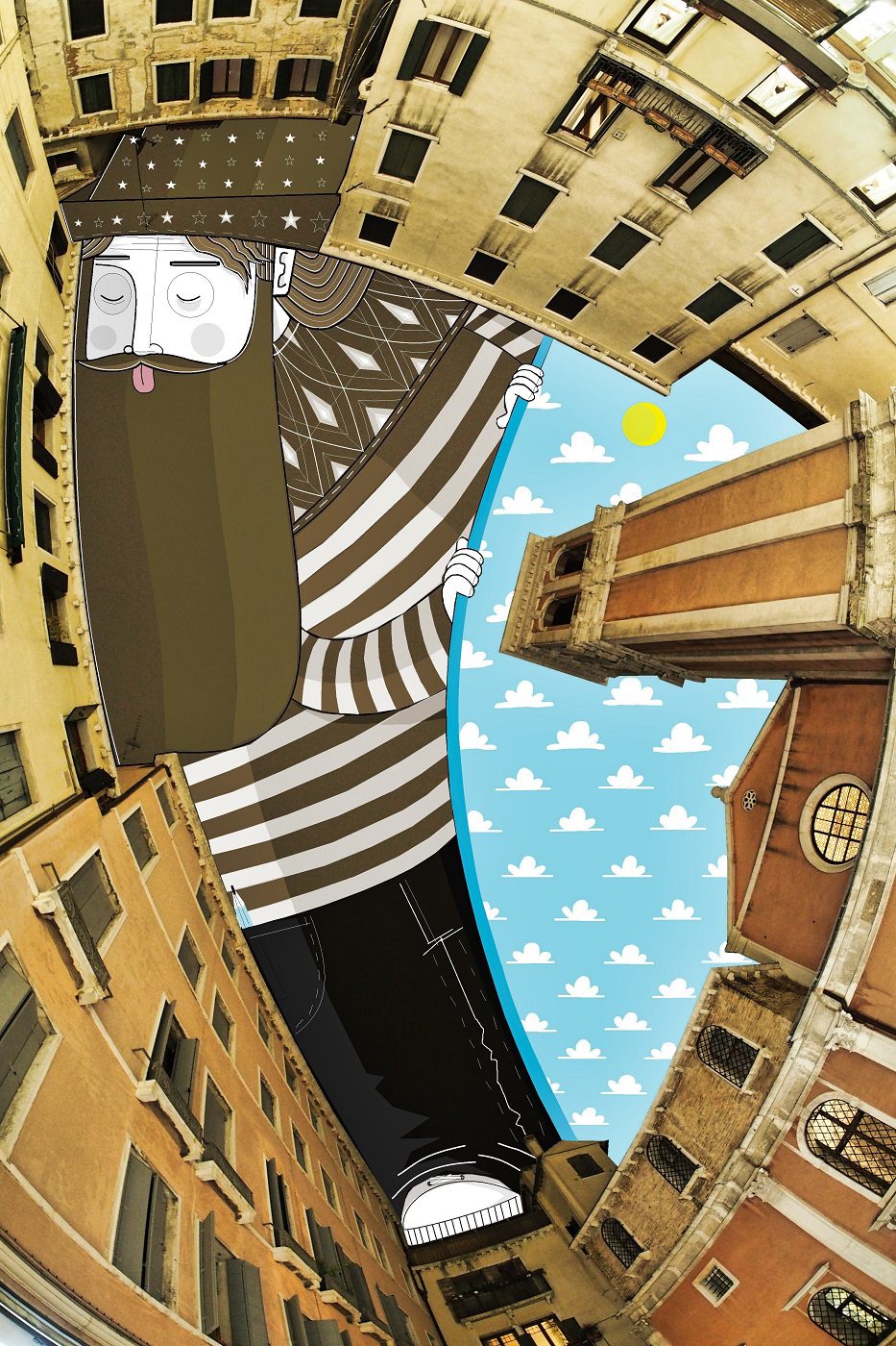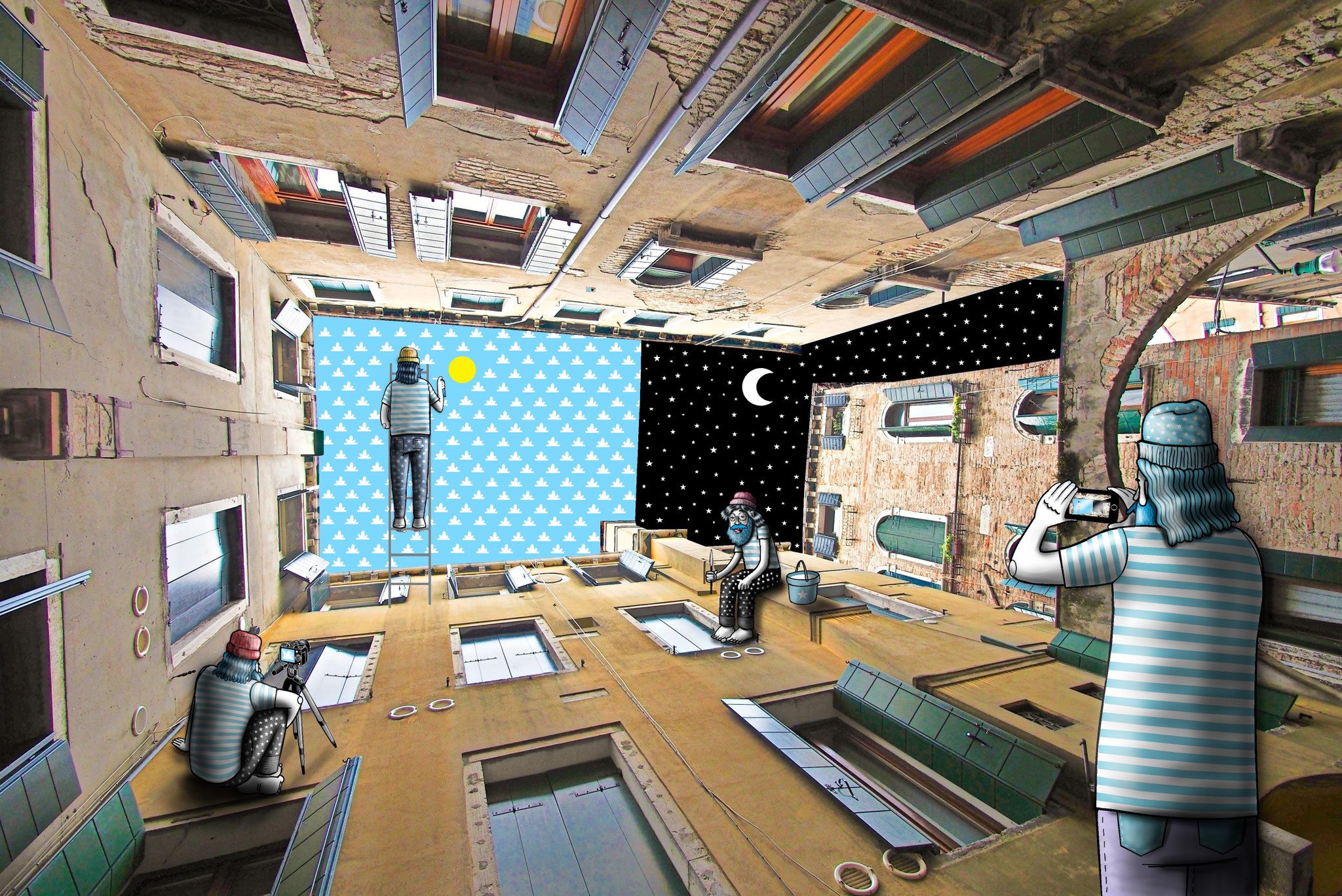 The French artist Thomas Lamadieu has taken these skyscapes for his canvases. On top of photographs shot skyward, he lays down his mind’s marks of what occupies the voids. A guitar-playing chicken, a strung-out owl, a racoon-riding Scotsman- the truth is that the mind is the limit. And so there is no limit. The resulting illustrations become part of the artist’s Sky Art series.