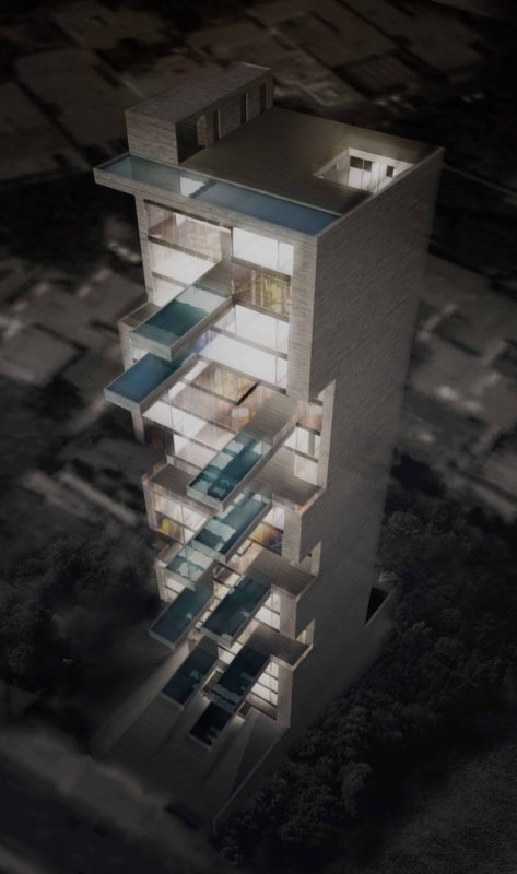 Sky Condos by DCPP Arquitectos takes the idea of a residential tower and transforms it into a unique living space, unbounded by the need to have every apartment space to be identical. The building itself is 20 stories consisting of three types of apartments that adjust to different necessities, where each condo has a clear individuality and uses the private exterior spaces as the main core. The structure consists of a transparent glass façade and a series of elevated courtyards to emphasis the firm’s belief that “an apartment shouldn’t lack exterior space.” By making the façade mainly transparent the connection between interior and exterior space is enhanced as a new relation between public and private areas is pursued.”]