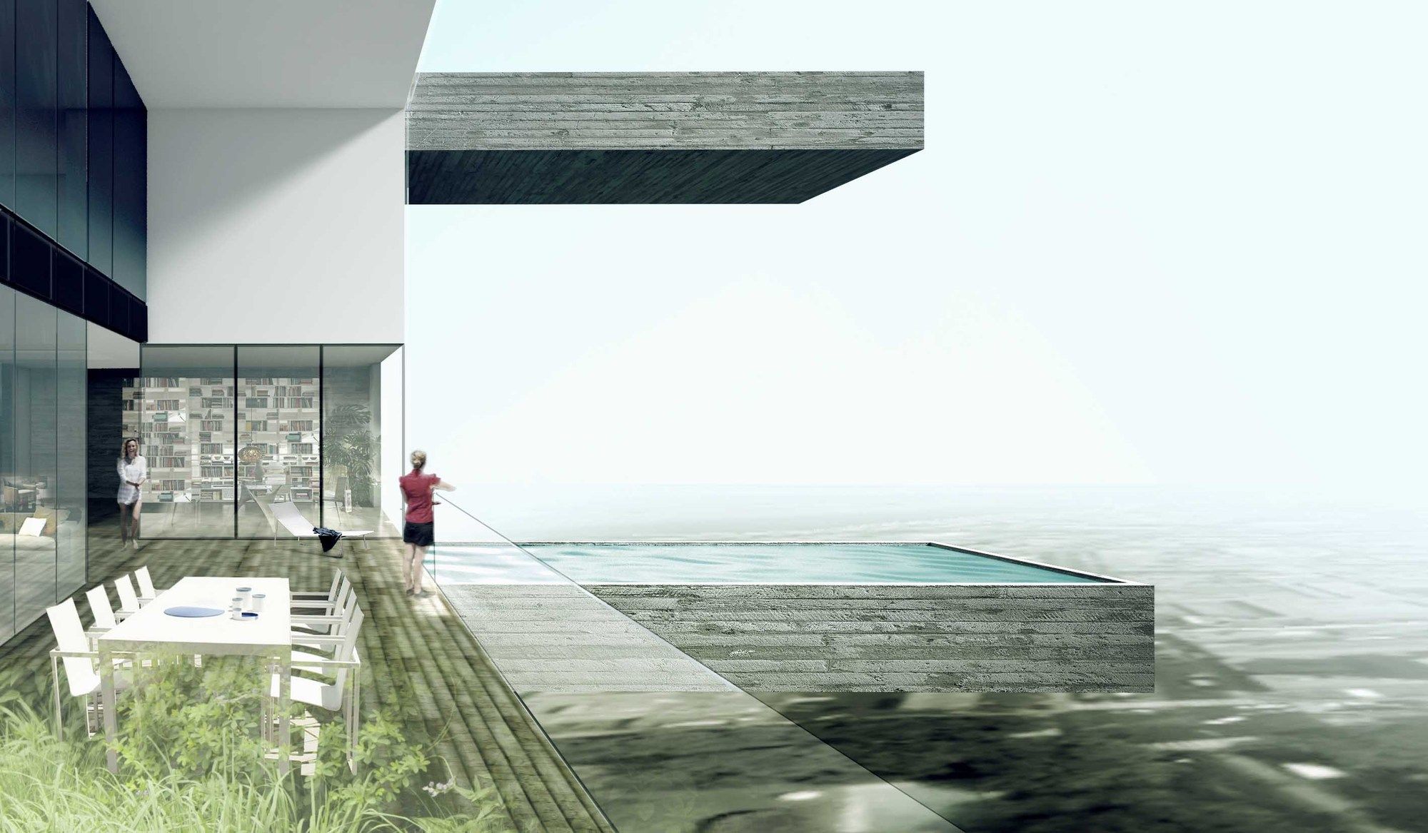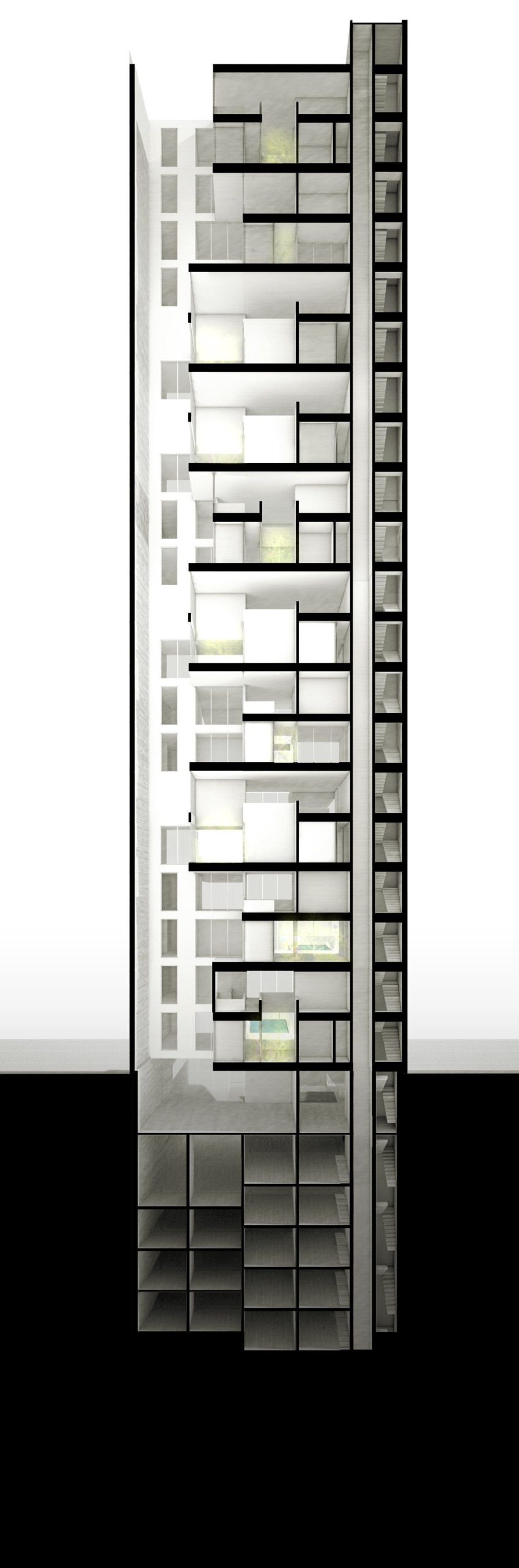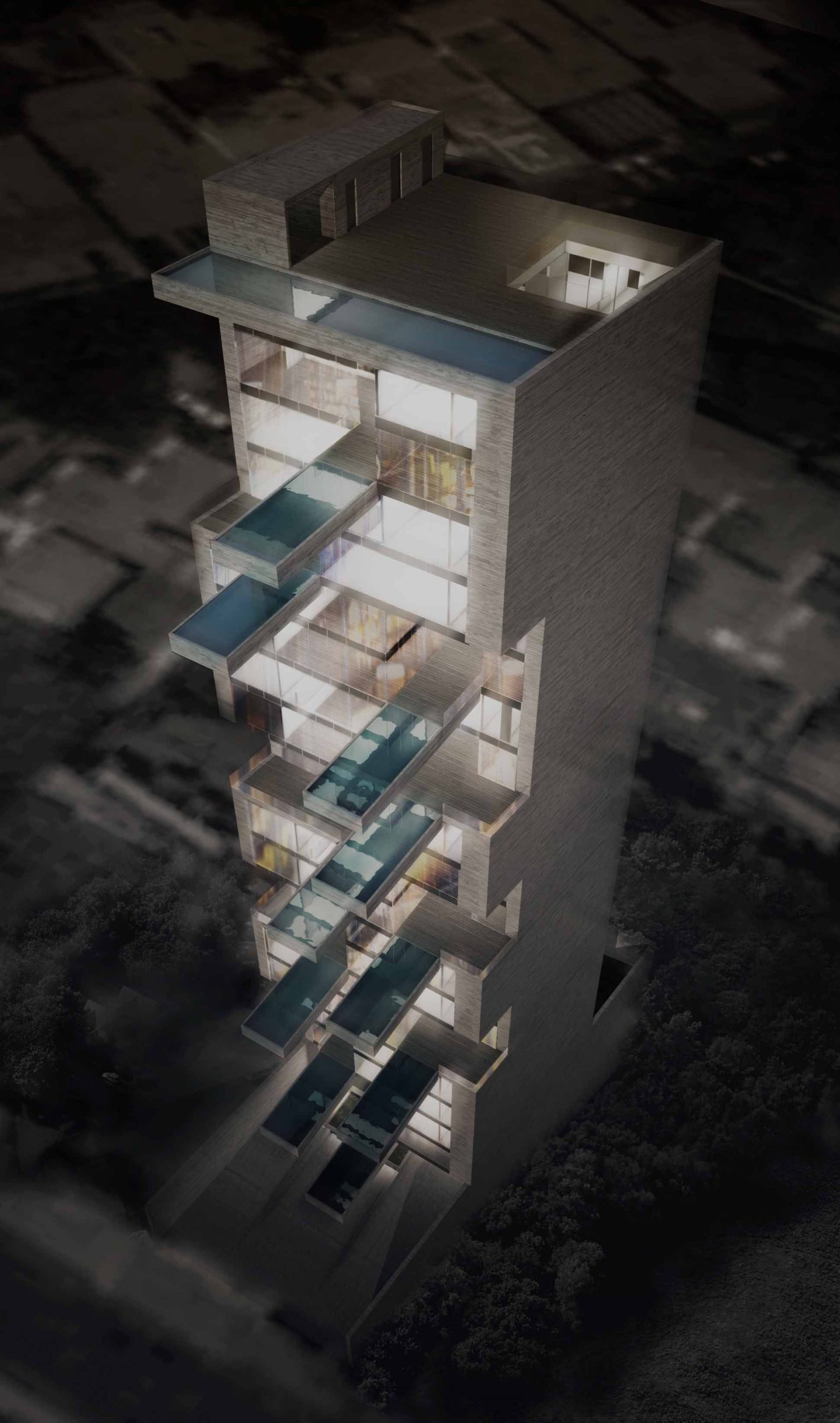 In order to further separate this design from the drab and boring stacked residential buildings, connected on to each courtyard a concrete swimming pool is cantilevered from the structure. With the main space of each apartment being the exterior spaces, the pool and terraces bring dynamism to the whole tower. The terraces are used to help fill the apartments with natural light and create a game of light and shadows. The way the apartments appear to be suspended and the cantilevered pools bring me to question a lot of things about structure within this project and if constructing something like this would even be possible. Still the proposal is a powerful interpretation of what an apartment complex can be like when given a little more imagination, and whether or not it is actually plausible only adds to its fanciful and fantastic nature.